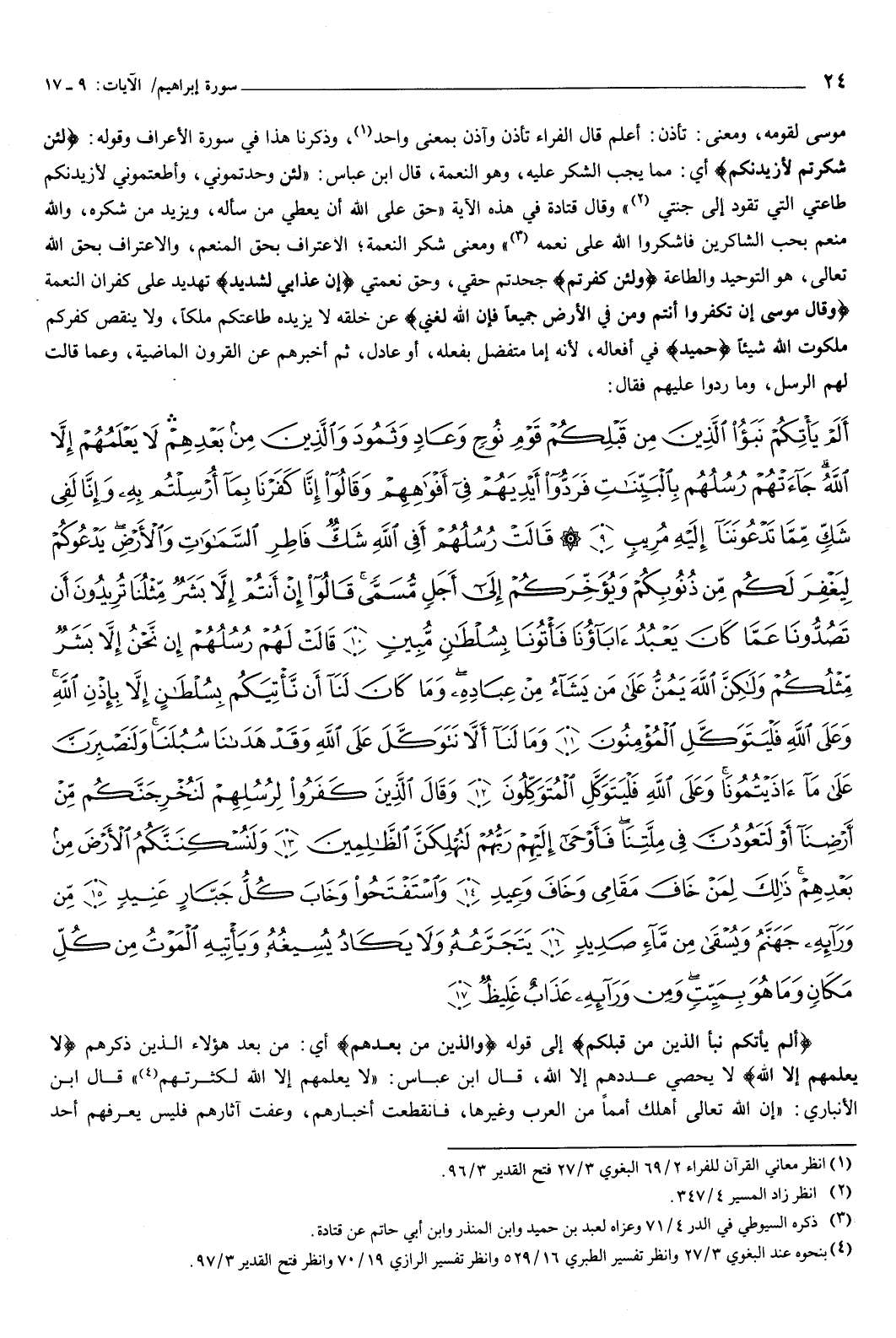 ثم أخبرهم، عن القرون الماضية، وعما قالت لهم الرسل، وما ردوا عليهم، فقال: {أَلَمْ يَأْتِكُمْ نَبَأُ الَّذِينَ مِنْ قَبْلِكُمْ قَوْمِ نُوحٍ وَعَادٍ وَثَمُودَ وَالَّذِينَ مِنْ بَعْدِهِمْ لا يَعْلَمُهُمْ إِلا اللَّهُ جَاءَتْهُمْ رُسُلُهُمْ بِالْبَيِّنَاتِ فَرَدُّوا أَيْدِيَهُمْ فِي أَفْوَاهِهِمْ وَقَالُوا إِنَّا كَفَرْنَا بِمَا أُرْسِلْتُمْ بِهِ وَإِنَّا لَفِي شَكٍّ مِمَّا تَدْعُونَنَا إِلَيْهِ مُرِيبٍ {9} قَالَتْ رُسُلُهُمْ أَفِي اللَّهِ شَكٌّ فَاطِرِ السَّمَوَاتِ وَالأَرْضِ يَدْعُوكُمْ لِيَغْفِرَ لَكُمْ مِنْ ذُنُوبِكُمْ وَيُؤَخِّرَكُمْ إِلَى أَجَلٍ مُسَمًّى قَالُوا إِنْ أَنْتُمْ إِلا بَشَرٌ مِثْلُنَا تُرِيدُونَ أَنْ تَصُدُّونَا عَمَّا كَانَ يَعْبُدُ آبَاؤُنَا فَأْتُونَا بِسُلْطَانٍ مُبِينٍ {10} قَالَتْ لَهُمْ رُسُلُهُمْ إِنْ نَحْنُ إِلا بَشَرٌ مِثْلُكُمْ وَلَكِنَّ اللَّهَ يَمُنُّ عَلَى مَنْ يَشَاءُ مِنْ عِبَادِهِ وَمَا كَانَ لَنَا أَنْ نَأْتِيَكُمْ بِسُلْطَانٍ إِلا بِإِذْنِ اللَّهِ وَعَلَى اللَّهِ فَلْيَتَوَكَّلِ الْمُؤْمِنُونَ {11} وَمَا لَنَا أَلَّا نَتَوَكَّلَ عَلَى اللَّهِ وَقَدْ هَدَانَا سُبُلَنَا وَلَنَصْبِرَنَّ عَلَى مَا آذَيْتُمُونَا وَعَلَى اللَّهِ فَلْيَتَوَكَّلِ الْمُتَوَكِّلُونَ {12} وَقَالَ الَّذِينَ كَفَرُوا لِرُسُلِهِمْ لَنُخْرِجَنَّكُمْ مِنْ أَرْضِنَا أَوْ لَتَعُودُنَّ فِي مِلَّتِنَا فَأَوْحَى إِلَيْهِمْ رَبُّهُمْ لَنُهْلِكَنَّ الظَّالِمِينَ {13} وَلَنُسْكِنَنَّكُمُ الأَرْضَ مِنْ بَعْدِهِمْ ذَلِكَ لِمَنْ خَافَ مَقَامِي وَخَافَ وَعِيدِ {14} وَاسْتَفْتَحُوا وَخَابَ كُلُّ جَبَّارٍ عَنِيدٍ {15} مِنْ وَرَائِهِ جَهَنَّمُ وَيُسْقَى مِنْ مَاءٍ صَدِيدٍ {16} يَتَجَرَّعُهُ وَلا يَكَادُ يُسِيغُهُ وَيَأْتِيهِ الْمَوْتُ مِنْ كُلِّ مَكَانٍ وَمَا هُوَ بِمَيِّتٍ وَمِنْ وَرَائِهِ عَذَابٌ غَلِيظٌ {17} } [إبراهيم: 9-17] {أَلَمْ يَأْتِكُمْ نَبَأُ الَّذِينَ مِنْ قَبْلِكُمْ} [إبراهيم: 9] إلى قوله: {وَالَّذِينَ مِنْ بَعْدِهِمْ} [إبراهيم: 9] أي: من بعد هؤلاء الذين ذكرهم، {لا يَعْلَمُهُمْ إِلا اللَّهُ} [إبراهيم: 9] لا يحصي عددهم إلا الله، قال ابن عباس: لا يعلمهم إلا الله لكثرتهم.