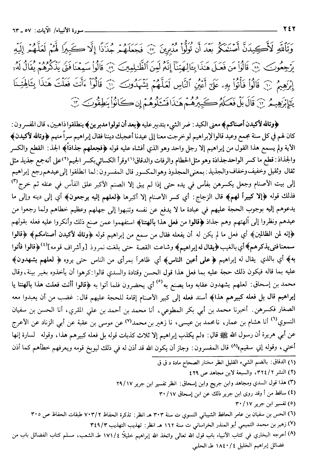 وَتَاللَّهِ لأَكِيدَنَّ أَصْنَامَكُمْ بَعْدَ أَنْ تُوَلُّوا مُدْبِرِينَ {57} فَجَعَلَهُمْ جُذَاذًا إِلا كَبِيرًا لَهُمْ لَعَلَّهُمْ إِلَيْهِ يَرْجِعُونَ {58} قَالُوا مَنْ فَعَلَ هَذَا بِآلِهَتِنَا إِنَّهُ لَمِنَ الظَّالِمِينَ {59} قَالُوا سَمِعْنَا فَتًى يَذْكُرُهُمْ يُقَالُ لَهُ إِبْرَاهِيمُ {60} قَالُوا فَأْتُوا بِهِ عَلَى أَعْيُنِ النَّاسِ لَعَلَّهُمْ يَشْهَدُونَ {61} قَالُوا أَأَنْتَ فَعَلْتَ هَذَا بِآلِهَتِنَا يَا إِبْرَاهِيمُ {62} قَالَ بَلْ فَعَلَهُ كَبِيرُهُمْ هَذَا فَاسْأَلُوهُمْ إِنْ كَانُوا يَنْطِقُونَ {63} } [الأنبياء: 57-63] {وَتَاللَّهِ لأَكِيدَنَّ أَصْنَامَكُمْ} [الأنبياء: 57] معنى الكيد: ضر الشيء بتدبير عليه، {بَعْدَ أَنْ تُوَلُّوا مُدْبِرِينَ} [الأنبياء: 57] ينطلقوا ذاهبين، قال المفسرون: كان لهم في كل سنة مجمع وعيد، قالوا لإبراهيم: لو خرجت معنا إلى عيدنا أعجبك ديننا.