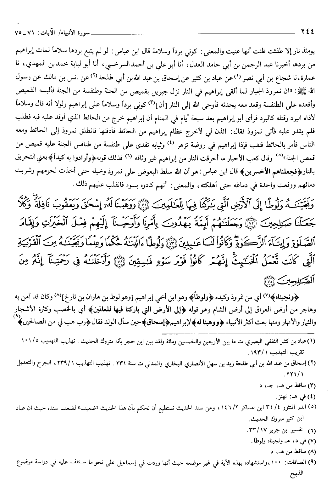 {وَنَجَّيْنَاهُ وَلُوطًا إِلَى الأَرْضِ الَّتِي بَارَكْنَا فِيهَا لِلْعَالَمِينَ {71} وَوَهَبْنَا لَهُ إِسْحَاقَ وَيَعْقُوبَ نَافِلَةً وَكُلًّا جَعَلْنَا صَالِحِينَ {72} وَجَعَلْنَاهُمْ أَئِمَّةً يَهْدُونَ بِأَمْرِنَا وَأَوْحَيْنَا إِلَيْهِمْ فِعْلَ الْخَيْرَاتِ وَإِقَامَ الصَّلاةِ وَإِيتَاءَ الزَّكَاةِ وَكَانُوا لَنَا عَابِدِينَ {73} وَلُوطًا آتَيْنَاهُ حُكْمًا وَعِلْمًا وَنَجَّيْنَاهُ مِنَ الْقَرْيَةِ الَّتِي كَانَتْ تَعْمَلُ الْخَبَائِثَ إِنَّهُمْ كَانُوا قَوْمَ سَوْءٍ فَاسِقِينَ {74} وَأَدْخَلْنَاهُ فِي رَحْمَتِنَا إِنَّهُ مِنَ الصَّالِحِينَ {75} } [الأنبياء: 71-75] ونجيناه أي: من نمروذ وكيده، ولوطا وهو ابن أخي إبراهيم، وهو لوط بن هاران بن تارخ، وكان قد آمن به وهاجر من أرض العراق إلى أرض الشام، وهو قوله: {إِلَى الأَرْضِ الَّتِي بَارَكْنَا فِيهَا لِلْعَالَمِينَ} [الأنبياء: 71] أي: بالخصب وكثرة الأشجار، والثمار، والأنهار، ومنها بعث أكثر الأنبياء.
