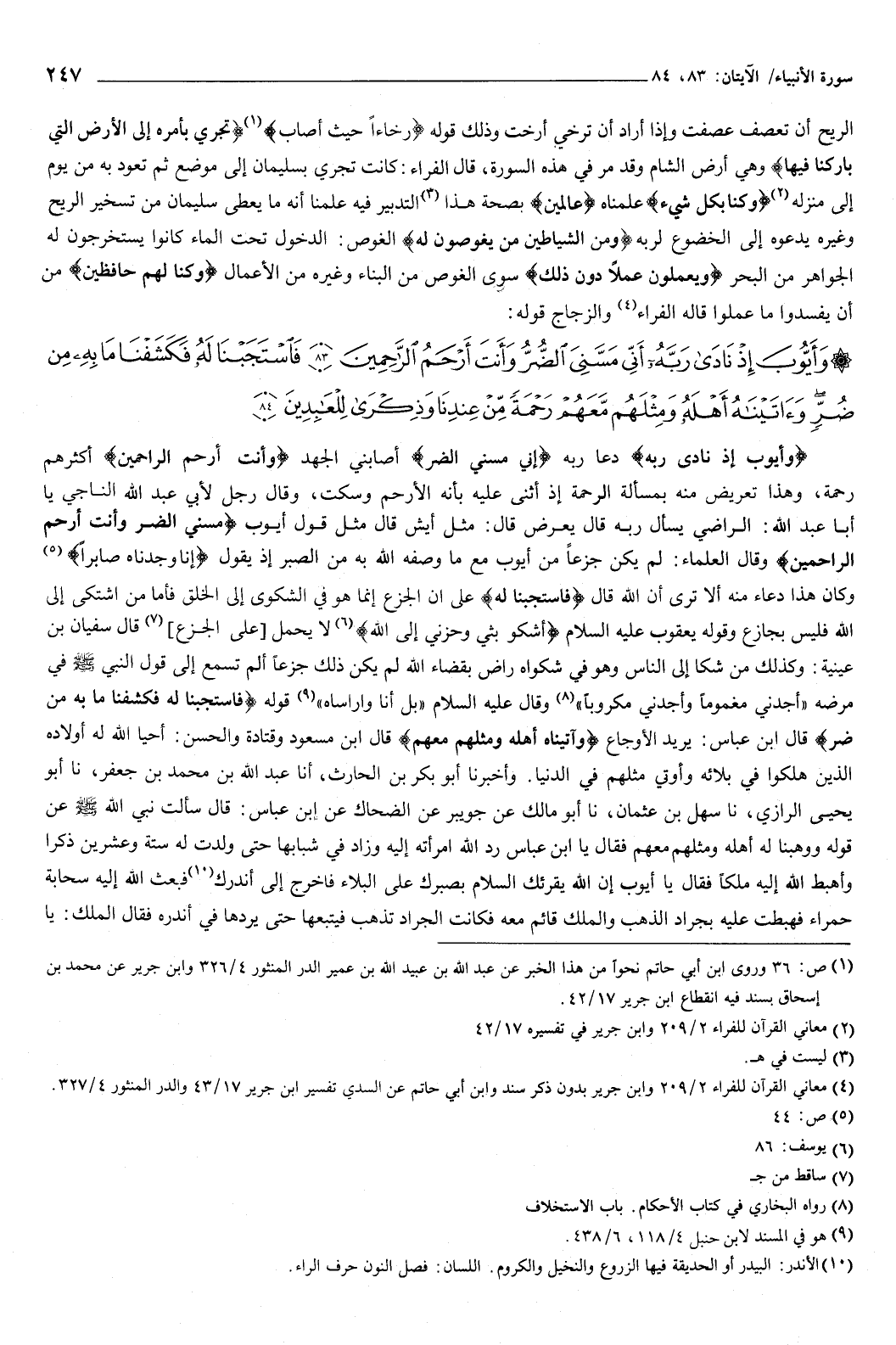 قوله: {وَأَيُّوبَ إِذْ نَادَى رَبَّهُ أَنِّي مَسَّنِيَ الضُّرُّ وَأَنْتَ أَرْحَمُ الرَّاحِمِينَ {83} فَاسْتَجَبْنَا لَهُ فَكَشَفْنَا مَا بِهِ مِنْ ضُرٍّ وَآتَيْنَاهُ أَهْلَهُ وَمِثْلَهُمْ مَعَهُمْ رَحْمَةً مِنْ عِنْدِنَا وَذِكْرَى لِلْعَابِدِينَ {84} } [الأنبياء: 83-84] {وَأَيُّوبَ إِذْ نَادَى رَبَّهُ} [الأنبياء: 83] دعا ربه، {أَنِّي مَسَّنِيَ الضُّرُّ} [الأنبياء: 83] أصابني الجهد، {وَأَنْتَ أَرْحَمُ الرَّاحِمِينَ} [الأنبياء: 83] أكثرهم رحمة، وهذا تعريض منه بمسألة الرحمة، إذ أثنى عليه بأنه الأرحم وسكت، وقال رجل لأبي عبد الله الناجي: يا أبا عبد الله، الراضي يسأل ربه.