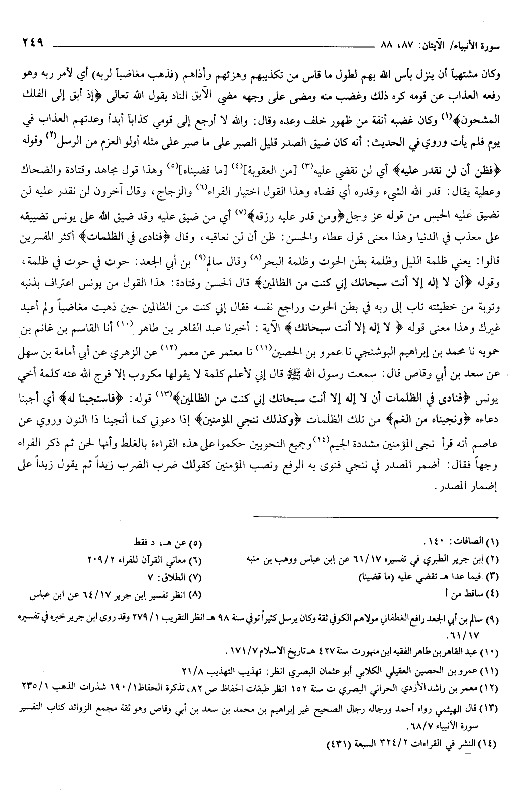 وقوله:} أَنْ لا إِلَهَ إِلا أَنْتَ سُبْحَانَكَ إِنِّي كُنْتُ مِنَ الظَّالِمِينَ { [الأنبياء: 87] قال الحسن، وقتادة: هذا القول من يونس اعتراف بذنبه وتوبة من خطيئته، تاب إلى ربه في بطن الحوت، وراجع نفسه، فقال: إني كنت من الظالمين حين ذهبت مغاضبا، ولم أعبد غيرك.