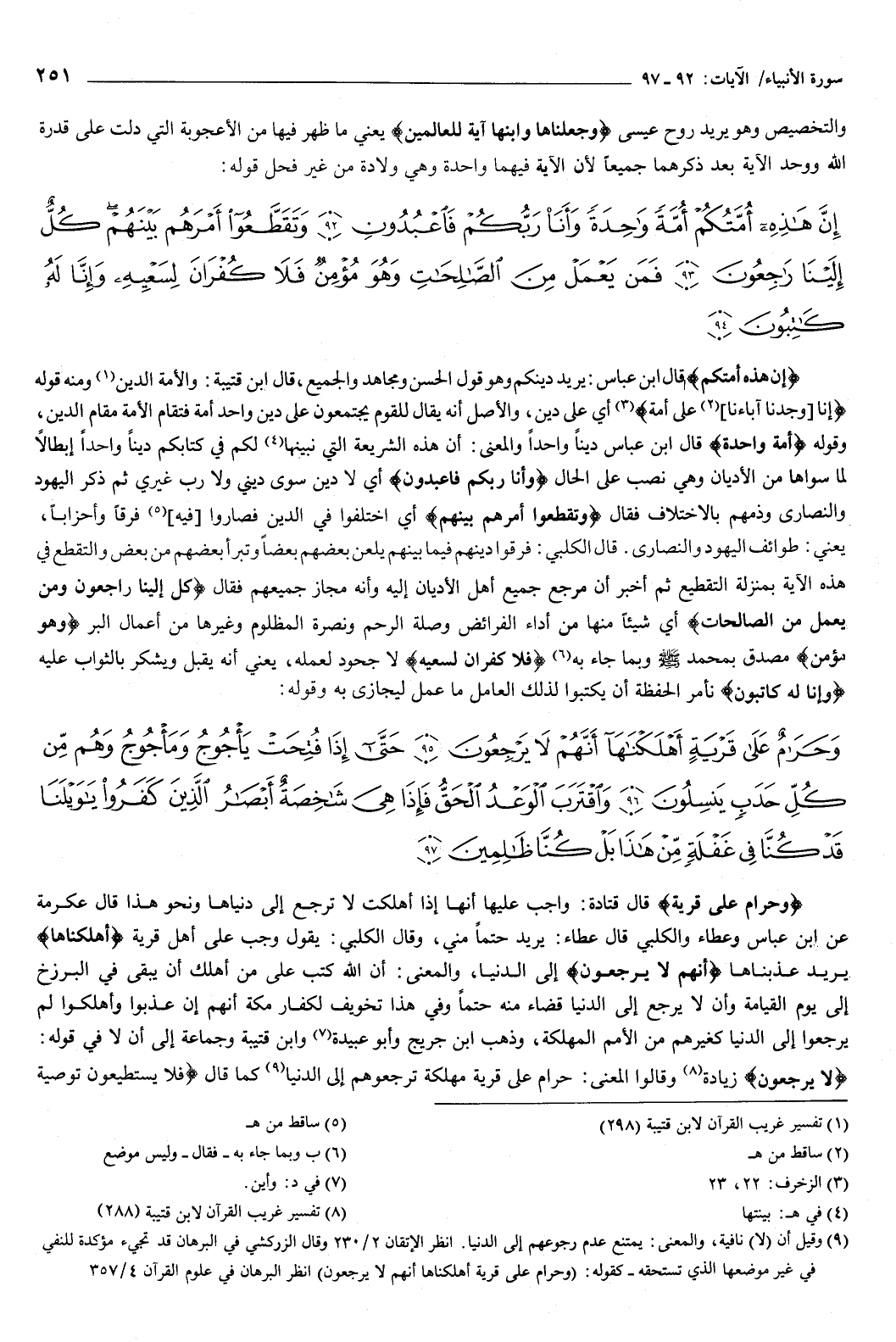 قوله: {إِنَّ هَذِهِ أُمَّتُكُمْ أُمَّةً وَاحِدَةً وَأَنَا رَبُّكُمْ فَاعْبُدُونِ {92} وَتَقَطَّعُوا أَمْرَهُمْ بَيْنَهُمْ كُلٌّ إِلَيْنَا رَاجِعُونَ {93} فَمَنْ يَعْمَلْ مِنَ الصَّالِحَاتِ وَهُوَ مُؤْمِنٌ فَلا كُفْرَانَ لِسَعْيِهِ وَإِنَّا لَهُ كَاتِبُونَ {94} } [الأنبياء: 92-94] {إِنَّ هَذِهِ أُمَّتُكُمْ} [الأنبياء: 92] قال ابن عباس: يريد دينكم.