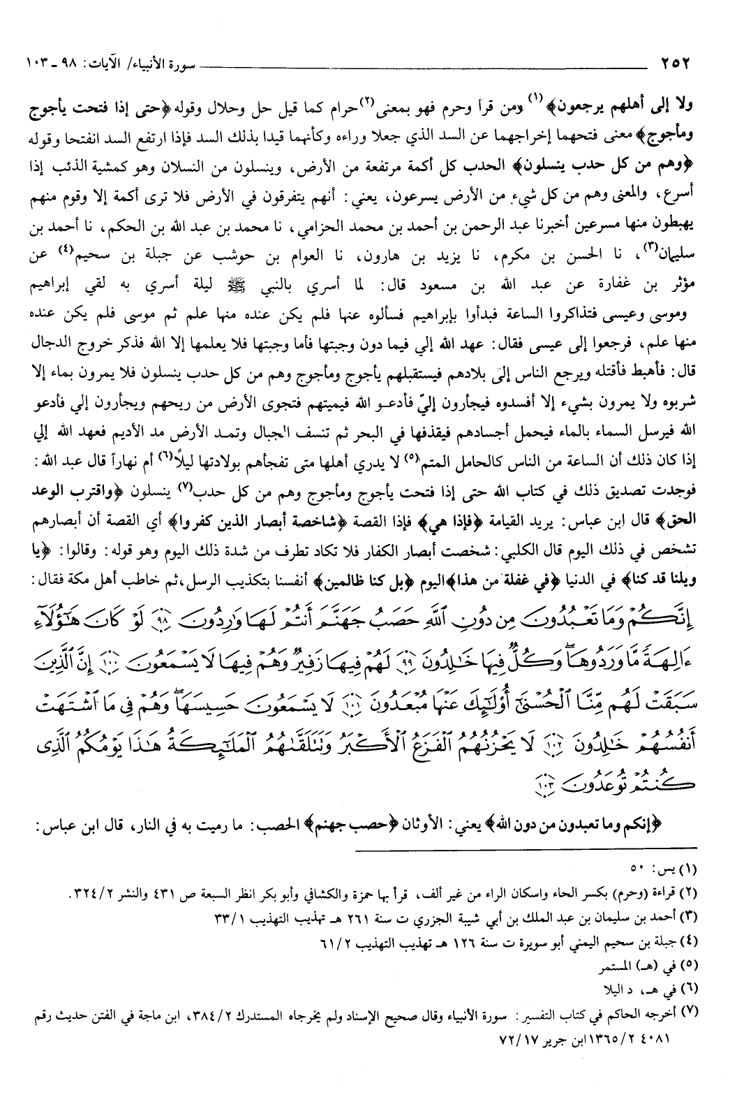 ثم خاطب أهل مكة، فقال: {إِنَّكُمْ وَمَا تَعْبُدُونَ مِنْ دُونِ اللَّهِ حَصَبُ جَهَنَّمَ أَنْتُمْ لَهَا وَارِدُونَ {98} لَوْ كَانَ هَؤُلاءِ آلِهَةً مَا وَرَدُوهَا وَكُلٌّ فِيهَا خَالِدُونَ {99} لَهُمْ فِيهَا زَفِيرٌ وَهُمْ فِيهَا لا يَسْمَعُونَ {100} إِنَّ الَّذِينَ سَبَقَتْ لَهُمْ مِنَّا الْحُسْنَى أُولَئِكَ عَنْهَا مُبْعَدُونَ {101} لا يَسْمَعُونَ حَسِيسَهَا وَهُمْ فِي مَا اشْتَهَتْ أَنْفُسُهُمْ خَالِدُونَ {102} لا يَحْزُنُهُمُ الْفَزَعُ الأَكْبَرُ وَتَتَلَقَّاهُمُ الْمَلائِكَةُ هَذَا يَوْمُكُمُ الَّذِي كُنْتُمْ تُوعَدُونَ {103} } [الأنبياء: 98-103] {إِنَّكُمْ وَمَا تَعْبُدُونَ مِنْ دُونِ اللَّهِ} [الأنبياء: 98] يعني: الأوثان، حصب جهنم الحصب: ما رميت به في النار، قال ابن عباس: