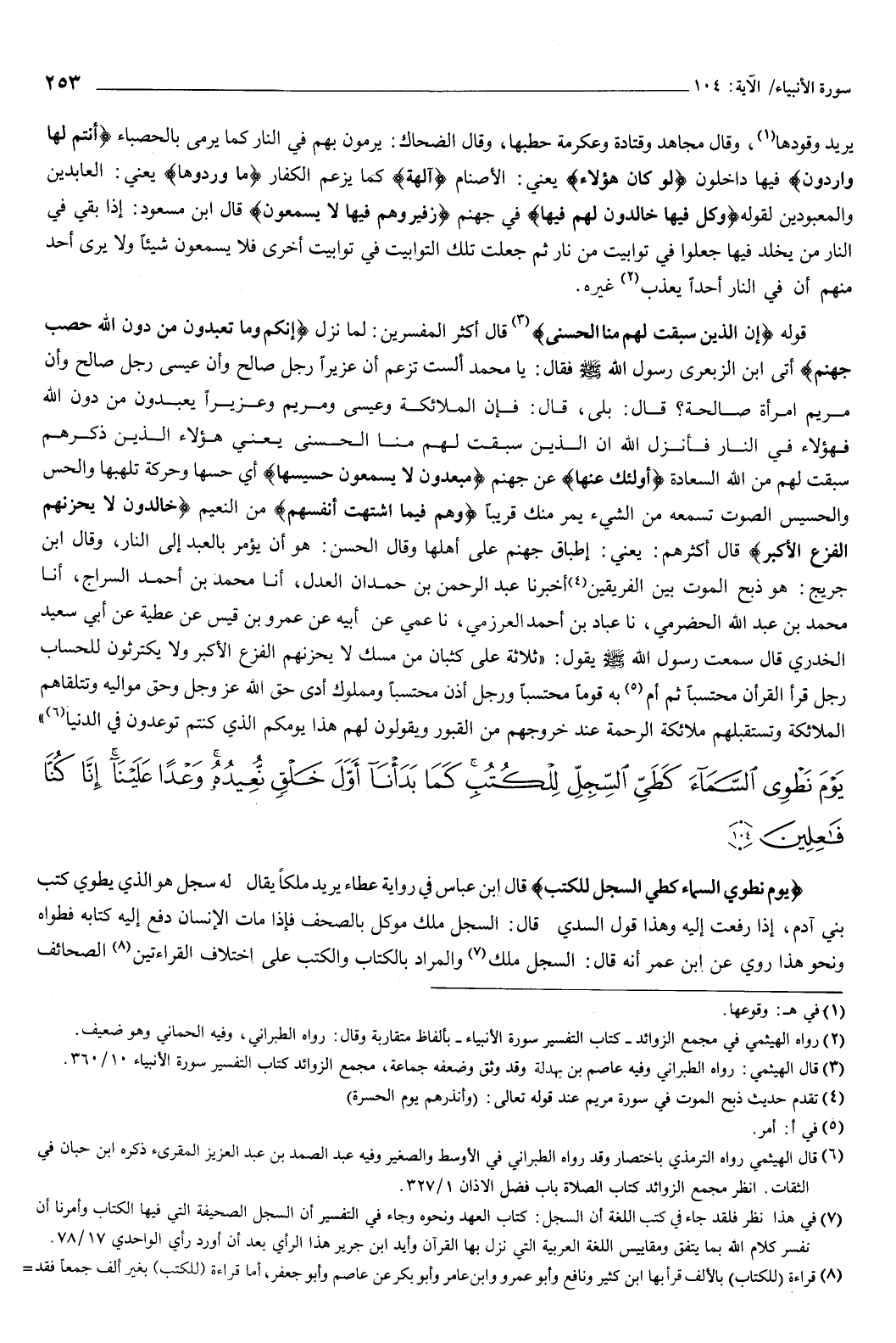 قوله: {إِنَّ الَّذِينَ سَبَقَتْ لَهُمْ مِنَّا الْحُسْنَى} [الأنبياء: 101] قال أكثر المفسرين: لما نزل {إِنَّكُمْ وَمَا تَعْبُدُونَ مِنْ دُونِ اللَّهِ حَصَبُ جَهَنَّمَ} [الأنبياء: 98] أتى ابن الزبعرى رسول الله صَلَّى اللهُ عَلَيْهِ وَسَلَّمَ، فقال: يا محمد، ألست تزعم أن عزيرا رجل صالح، وأن عيسى رجل صالح، وأن مريم امرأة صالحة؟ قال: بلى.