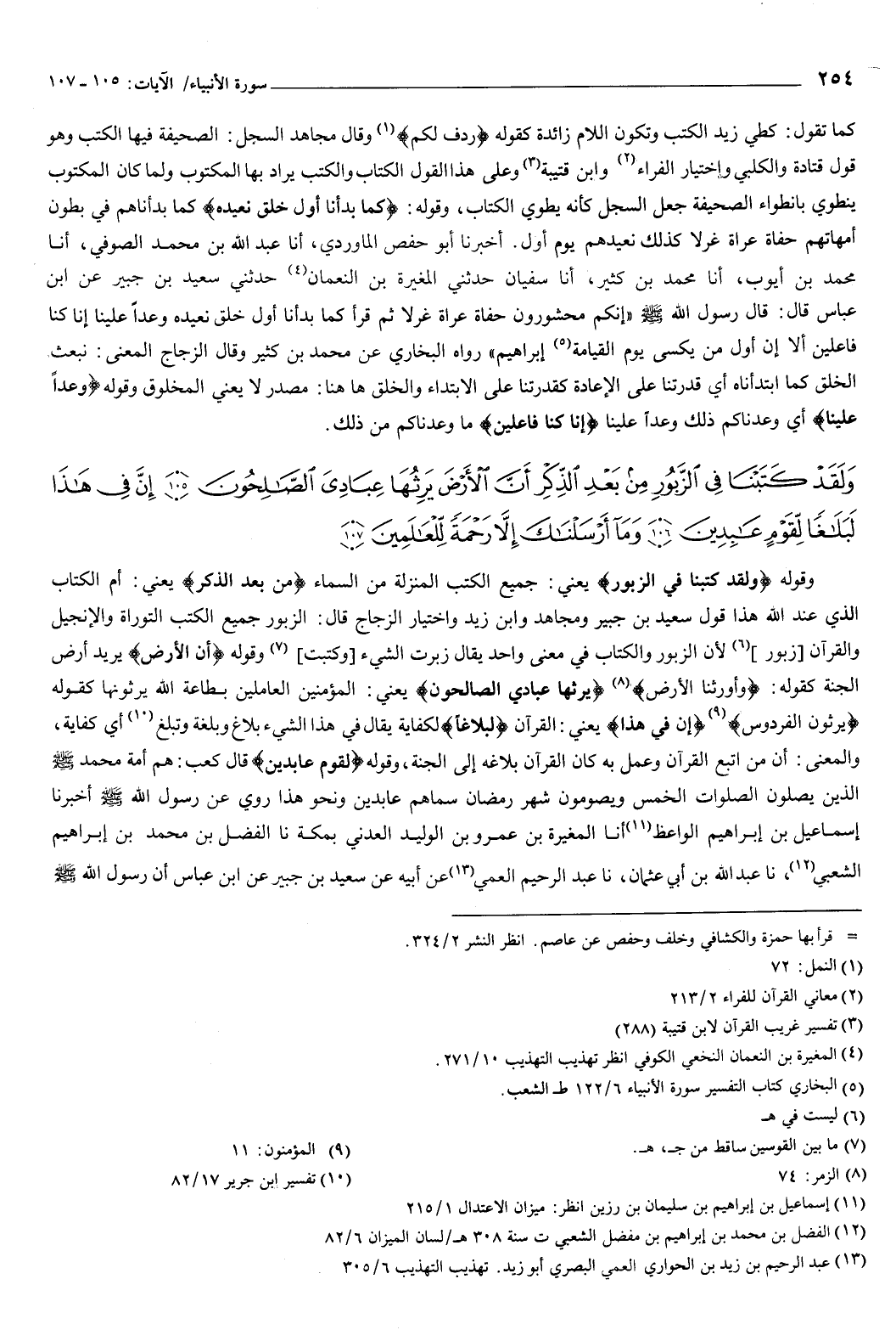 {وَلَقَدْ كَتَبْنَا فِي الزَّبُورِ مِنْ بَعْدِ الذِّكْرِ أَنَّ الأَرْضَ يَرِثُهَا عِبَادِيَ الصَّالِحُونَ {105} إِنَّ فِي هَذَا لَبَلاغًا لِقَوْمٍ عَابِدِينَ {106} وَمَا أَرْسَلْنَاكَ إِلا رَحْمَةً لِلْعَالَمِينَ {107} } [الأنبياء: 105-107] وقوله: {وَلَقَدْ كَتَبْنَا فِي الزَّبُورِ} [الأنبياء: 105] يعني: جميع الكتب المنزلة من السماء، {مِنْ بَعْدِ الذِّكْرِ} [الأنبياء: 105] يعني: أم الكتاب الذي عند الله، هذا قول سعيد بن جبير، ومجاهد، وابن زيد، واختيار الزجاج، قال: الزبور جميع الكتب التوراة والإنجيل، والقرآن زبور لأن الزبور والكتاب في معنى واحد، يقال: زبرت الشيء وكتبت.
