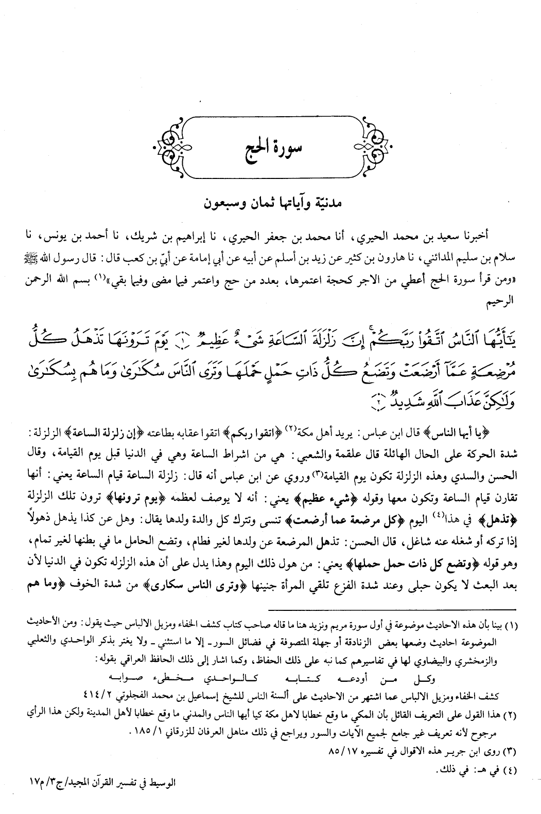 بسم الله الرحمن الرحيم {يَأَيُّهَا النَّاسُ اتَّقُوا رَبَّكُمْ إِنَّ زَلْزَلَةَ السَّاعَةِ شَيْءٌ عَظِيمٌ {1} يَوْمَ تَرَوْنَهَا تَذْهَلُ كُلُّ مُرْضِعَةٍ عَمَّا أَرْضَعَتْ وَتَضَعُ كُلُّ ذَاتِ حَمْلٍ حَمْلَهَا وَتَرَى النَّاسَ سُكَارَى وَمَا هُمْ بِسُكَارَى وَلَكِنَّ عَذَابَ اللَّهِ شَدِيدٌ {2} } [الحج: 1-2] {يَأَيُّهَا النَّاسُ} [الحج: 1] قال ابن عباس: يريد أهل مكة.