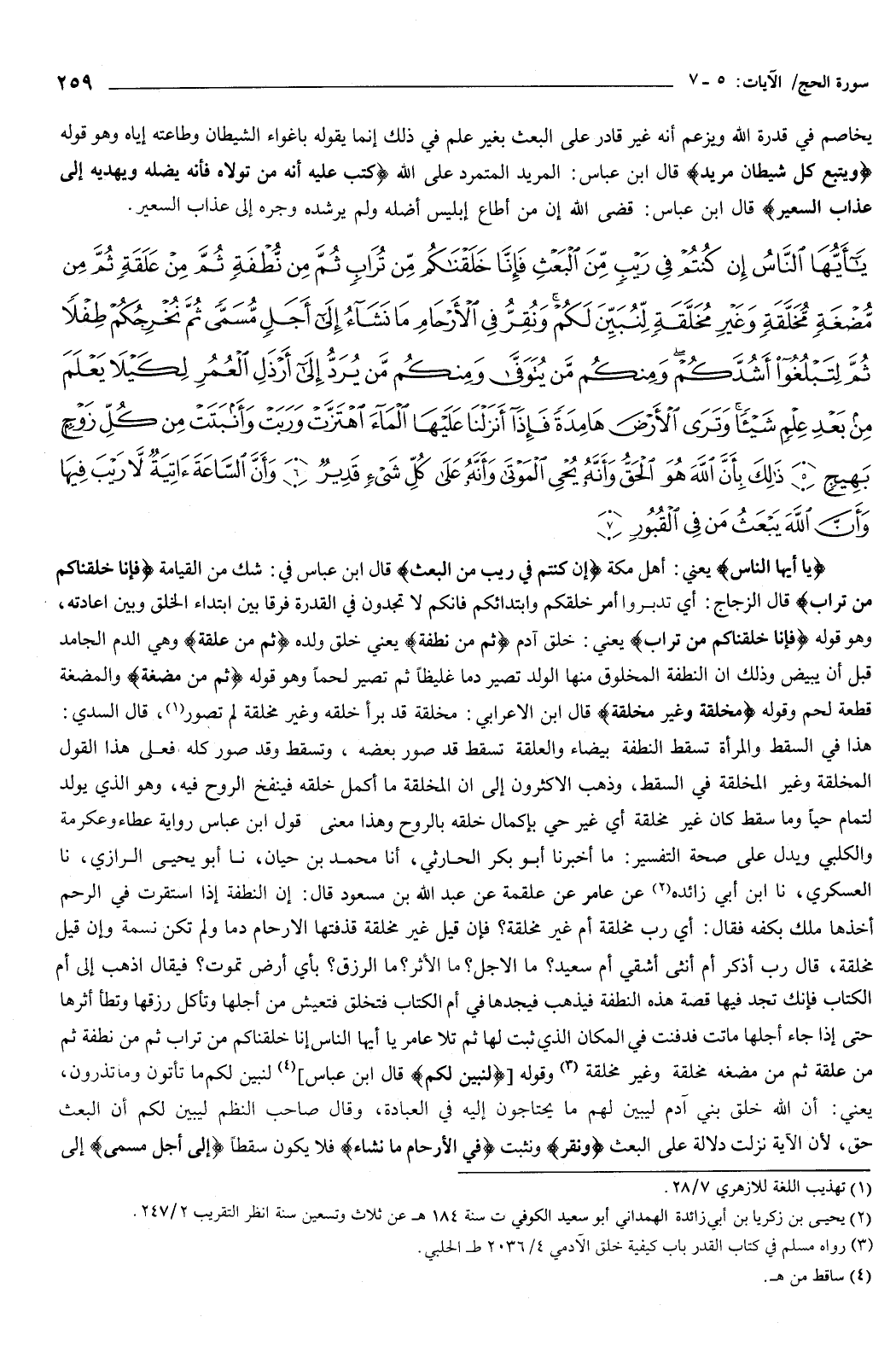 {يَأَيُّهَا النَّاسُ إِنْ كُنْتُمْ فِي رَيْبٍ مِنَ الْبَعْثِ فَإِنَّا خَلَقْنَاكُمْ مِنْ تُرَابٍ ثُمَّ مِنْ نُطْفَةٍ ثُمَّ مِنْ عَلَقَةٍ ثُمَّ مِنْ مُضْغَةٍ مُخَلَّقَةٍ وَغَيْرِ مُخَلَّقَةٍ لِنُبَيِّنَ لَكُمْ وَنُقِرُّ فِي الأَرْحَامِ مَا نَشَاءُ إِلَى أَجَلٍ مُسَمًّى ثُمَّ نُخْرِجُكُمْ طِفْلا ثُمَّ لِتَبْلُغُوا أَشُدَّكُمْ وَمِنْكُمْ مَنْ يُتَوَفَّى وَمِنْكُمْ مَنْ يُرَدُّ إِلَى أَرْذَلِ الْعُمُرِ لِكَيْلا يَعْلَمَ مِنْ بَعْدِ عِلْمٍ شَيْئًا وَتَرَى الأَرْضَ هَامِدَةً فَإِذَا أَنْزَلْنَا عَلَيْهَا الْمَاءَ اهْتَزَّتْ وَرَبَتْ وَأَنْبَتَتْ مِنْ كُلِّ زَوْجٍ بَهِيجٍ {5} ذَلِكَ بِأَنَّ اللَّهَ هُوَ الْحَقُّ وَأَنَّهُ يُحْيِي الْمَوْتَى وَأَنَّهُ عَلَى كُلِّ شَيْءٍ قَدِيرٌ {6} وَأَنَّ السَّاعَةَ آتِيَةٌ لا رَيْبَ فِيهَا وَأَنَّ اللَّهَ يَبْعَثُ مَنْ فِي الْقُبُورِ {7} } [الحج: 5-7] {يَأَيُّهَا النَّاسُ} [الحج: 5] يعني: أهل مكة، {إِنْ كُنْتُمْ فِي رَيْبٍ مِنَ الْبَعْثِ} [الحج: 5] قال ابن عباس: في شك من القيامة.