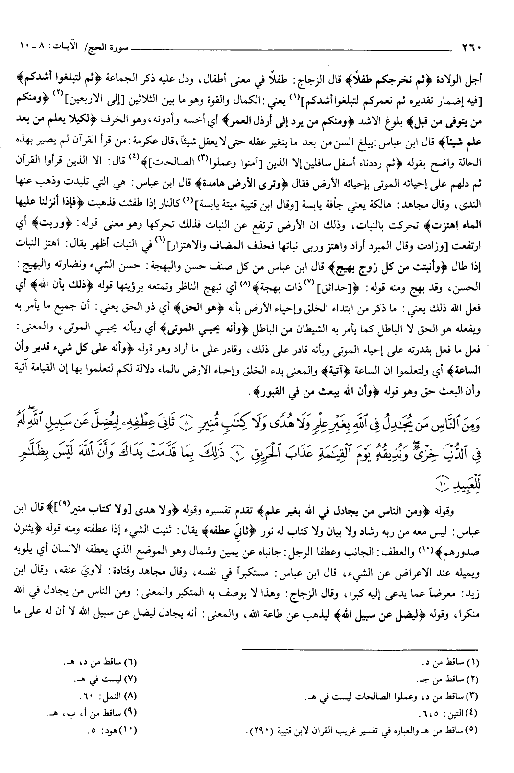 } وَمِنَ النَّاسِ مَنْ يُجَادِلُ فِي اللَّهِ بِغَيْرِ عِلْمٍ وَلا هُدًى وَلا كِتَابٍ مُنِيرٍ {8} ثَانِيَ عِطْفِهِ لِيُضِلَّ عَنْ سَبِيلِ اللَّهِ لَهُ فِي الدُّنْيَا خِزْيٌ وَنُذِيقُهُ يَوْمَ الْقِيَامَةِ عَذَابَ الْحَرِيقِ {9} ذَلِكَ بِمَا قَدَّمَتْ يَدَاكَ وَأَنَّ اللَّهَ لَيْسَ بِظَلامٍ لِلْعَبِيدِ {10} { [الحج: 8-10] وقوله:} وَمِنَ النَّاسِ مَنْ يُجَادِلُ فِي اللَّهِ بِغَيْرِ عِلْمٍ { [الحج: 8] تقدم تفسيره، وقوله:} وَلا هُدًى وَلا كِتَابٍ مُنِيرٍ { [الحج: 8] قال ابن عباس: ليس معه من ربه رشاد ولا بيان ولا كتاب له نور.