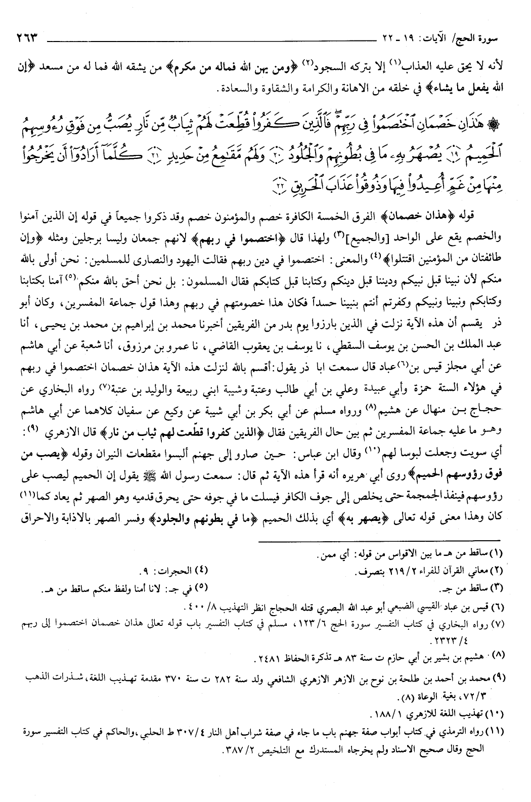 } هَذَانِ خَصْمَانِ اخْتَصَمُوا فِي رَبِّهِمْ فَالَّذِينَ كَفَرُوا قُطِّعَتْ لَهُمْ ثِيَابٌ مِنْ نَارٍ يُصَبُّ مِنْ فَوْقِ رُءُوسِهِمُ الْحَمِيمُ {19} يُصْهَرُ بِهِ مَا فِي بُطُونِهِمْ وَالْجُلُودُ {20} وَلَهُمْ مَقَامِعُ مِنْ حَدِيدٍ {21} كُلَّمَا أَرَادُوا أَنْ يَخْرُجُوا مِنْهَا مِنْ غَمٍّ أُعِيدُوا فِيهَا وَذُوقُوا عَذَابَ الْحَرِيقِ {22} { [الحج: 19-22] قوله:} هَذَانِ خَصْمَانِ { [الحج: 19] الفرق الخمسة الكافرة خصم، والمؤمنون خصم، وقد ذكروا جميعا في قوله:} إِنَّ الَّذِينَ آمَنُوا { [الحج: 17] والخصم يقع على الواحد والجميع، ولهذا قال:} اخْتَصَمُوا فِي رَبِّهِمْ { [الحج: 19] لأنهم جمعان وليسا برجلين، ومثله:} وَإِنْ طَائِفَتَانِ مِنَ الْمُؤْمِنِينَ اقْتَتَلُوا [الحجرات: 9] والمعنى: اختصموا في دين ربهم، فقالت اليهود والنصارى للمسلمين: نحن أولى بالله منكم، لأن نبينا قبل نبيكم، وديننا قبل دينكم، وكتابنا قبل كتابكم.