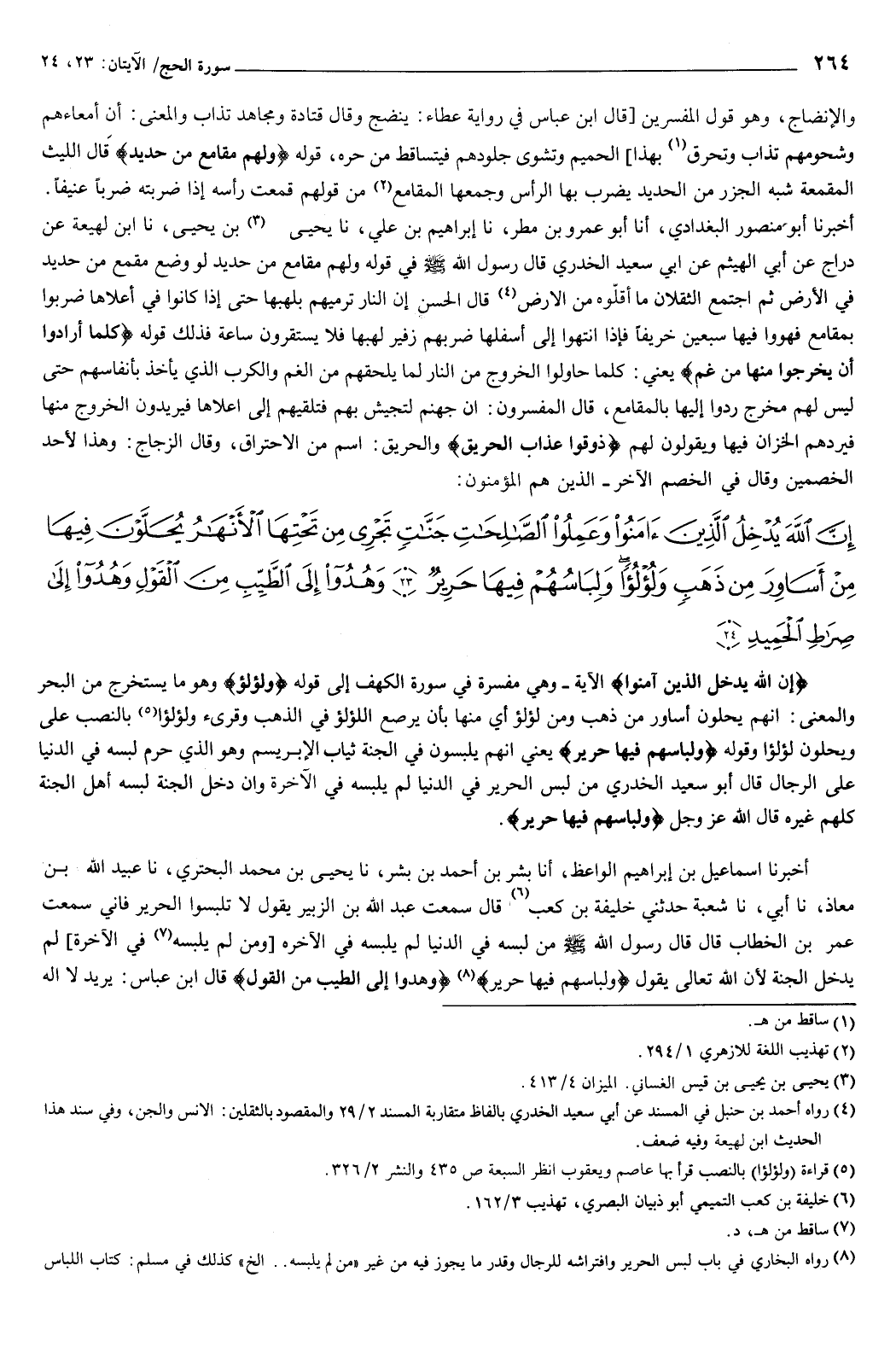 وقال الزجاج: وهذا لأحد الخصمين، وقال في الخصم الآخر، الذين هم المؤمنون: {إِنَّ اللَّهَ يُدْخِلُ الَّذِينَ آمَنُوا وَعَمِلُوا الصَّالِحَاتِ جَنَّاتٍ تَجْرِي مِنْ تَحْتِهَا الأَنْهَارُ يُحَلَّوْنَ فِيهَا مِنْ أَسَاوِرَ مِنْ ذَهَبٍ وَلُؤْلُؤًا وَلِبَاسُهُمْ فِيهَا حَرِيرٌ {23} وَهُدُوا إِلَى الطَّيِّبِ مِنَ الْقَوْلِ وَهُدُوا إِلَى صِرَاطِ الْحَمِيدِ {24} } [الحج: 23-24] {إِنَّ اللَّهَ يُدْخِلُ الَّذِينَ آمَنُوا} [الحج: 23] الآية، وهي مفسرة في { [الكهف إلى قوله: ولؤلؤ وهو ما يستخرج من البحر، والمعنى: إنهم يحلون أساور من ذهب ومن لؤلؤ، أي منها، بأن يرصع اللؤلؤ في الذهب، وقرئ ولؤلؤا بالنصب على ويحلون لؤلؤا، وقوله:] وَلِبَاسُهُمْ فِيهَا حَرِيرٌ} [سورة الحج: 23] يعني أنهم يلبسون في الجنة ثياب الإبريسم، وهو الذي حرم لبسه في الدنيا على الرجال، قال أبو سعيد الخدري: من لبس الحرير في الدنيا لم يلبسه في الآخرة، وإن دخل الجنة لبسه أهل الجنة كلهم غيره، قال الله عز وجل: {وَلِبَاسُهُمْ فِيهَا حَرِيرٌ} [الحج: 23] .