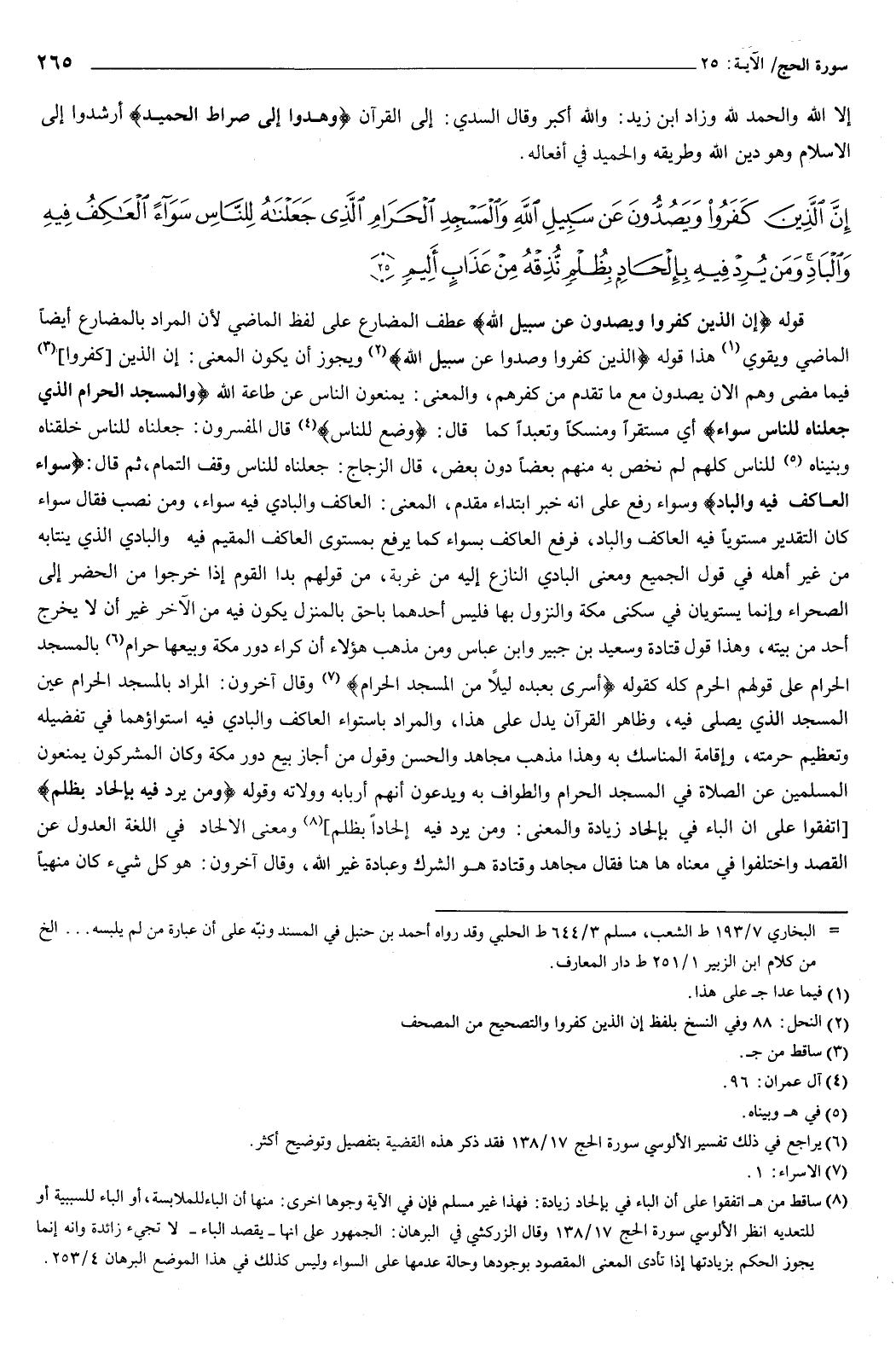 {إِنَّ الَّذِينَ كَفَرُوا وَيَصُدُّونَ عَنْ سَبِيلِ اللَّهِ وَالْمَسْجِدِ الْحَرَامِ الَّذِي جَعَلْنَاهُ لِلنَّاسِ سَوَاءً الْعَاكِفُ فِيهِ وَالْبَادِ وَمَنْ يُرِدْ فِيهِ بِإِلْحَادٍ بِظُلْمٍ نُذِقْهُ مِنْ عَذَابٍ أَلِيمٍ} [الحج: 25] قوله: {إِنَّ الَّذِينَ كَفَرُوا وَيَصُدُّونَ عَنْ سَبِيلِ اللَّهِ} [الحج: 25] عطف المضارع على لفظ الماضي، لأن المراد بالمضارع أيضا الماضي، ويقوي هذا قوله: {الَّذِينَ كَفَرُوا وَصَدُّوا عَنْ سَبِيلِ اللَّهِ} [محمد: 1] ويجوز أن يكون المعنى: إن الذين كفروا فيما مضى وهم الآن يصدون مع ما تقدم من كفرهم، والمعنى: يمنعون الناس عن طاعة الله، {وَالْمَسْجِدِ الْحَرَامِ الَّذِي جَعَلْنَاهُ لِلنَّاسِ سَوَاءً} [الحج: 25] أي: مستقرا ومنسكا وتعبدا، كما قال: {وُضِعَ لِلنَّاسِ} [آل عمران: 96] قال المفسرون: جعلناه للناس خلقناه وبنيناه للناس كلهم، لم نخص به منهم بعضا دون بعض.