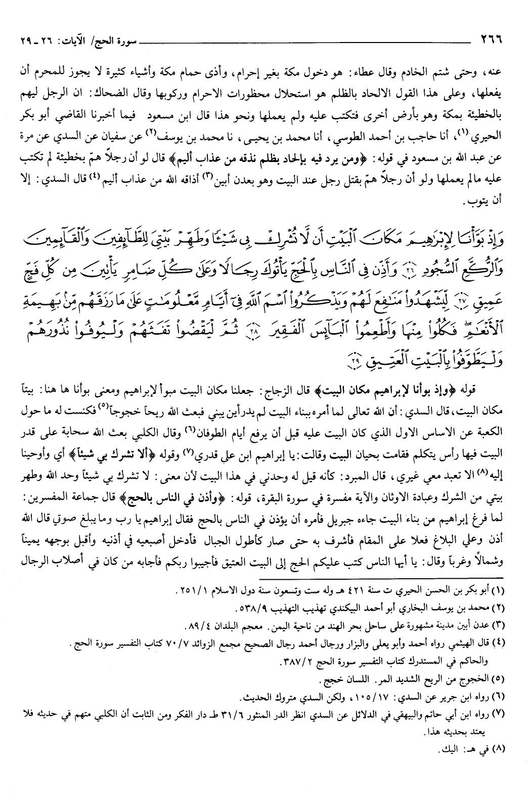 {وَإِذْ بَوَّأْنَا لإِبْرَاهِيمَ مَكَانَ الْبَيْتِ أَنْ لا تُشْرِكْ بِي شَيْئًا وَطَهِّرْ بَيْتِيَ لِلطَّائِفِينَ وَالْقَائِمِينَ وَالرُّكَّعِ السُّجُودِ {26} وَأَذِّنْ فِي النَّاسِ بِالْحَجِّ يَأْتُوكَ رِجَالا وَعَلَى كُلِّ ضَامِرٍ يَأْتِينَ مِنْ كُلِّ فَجٍّ عَمِيقٍ {27} لِيَشْهَدُوا مَنَافِعَ لَهُمْ وَيَذْكُرُوا اسْمَ اللَّهِ فِي أَيَّامٍ مَعْلُومَاتٍ عَلَى مَا رَزَقَهُمْ مِنْ بَهِيمَةِ الأَنْعَامِ فَكُلُوا مِنْهَا وَأَطْعِمُوا الْبَائِسَ الْفَقِيرَ {28} ثُمَّ لِيَقْضُوا تَفَثَهُمْ وَلْيُوفُوا نُذُورَهُمْ وَلْيَطَّوَّفُوا بِالْبَيْتِ الْعَتِيقِ {29} } [الحج: 26-29] قوله: {وَإِذْ بَوَّأْنَا لإِبْرَاهِيمَ مَكَانَ الْبَيْتِ} [الحج: 26] قال الزجاج: جعلنا مكان البيت مبوأ لإبراهيم، ومعنى بوأنا ههنا بيتا مكان البيت، قال السدي: إن الله تعالى لما أمره ببناء البيت لم يدر أين يبني، فبعث الله ريحا خجوجا، فكنست له ما حول الكعبة عن الأساس الأول الذي كان البيت عليه قبل أن يرفع أيام الطوفان، وقال الكلبي: بعث الله سحابة على قدر البيت فيها رأس يتكلم، فقامت بحيان البيت، وقالت: يا إبراهيم، ابن على قدري.