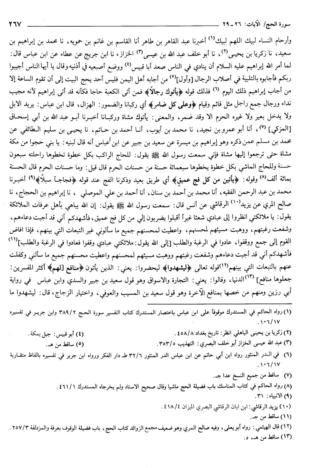 634 - أَخْبَرَنَا عَبْدُ الْقَاهِرِ بْنُ طَاهِرٍ، أنا الْقَاسِمُ بْنُ غَانِمِ بْنِ حَمُّوَيْهِ، نا مُحَمَّدُ بْنُ إِبْرَاهِيمَ بْنِ سَعِيدٍ، نا زَكَرِيَّا بْنُ يَحْيَى، نا أَبُو خَلَفٍ عَبْدُ اللَّهِ بْنُ عِيسَى الْخَزَّازُ، نا ابْنُ جُرَيْجٍ، عَنْ عَطَاءٍ، عَنِ ابْنِ عَبَّاسٍ، قَالَ: لَمَّا أَمَرَ اللَّهُ إِبْرَاهِيمَ، عَلَيْهِ السَّلامُ، أَنْ يُنَادِيَ فِي النَّاسِ صَعِدَ أَبَا قُبَيْسٍ وَوَضَعَ أُصْبُعَيْهِ فِي أُذُنَيْهِ، وَقَالَ: يَا أَيُّهَا النَّاسُ، أَجِيبُوا رَبَّكُمْ، فَأَجَابُوهُ بِالتَّلْبِيَةِ فِي أَصْلابِ الرِّجَالِ، وَأَوَّلُ مَنْ أَجَابَهُ أَهْلُ الْيَمَنِ، فَلَيْسَ أَحَدٌ يَحُجُّ الْبَيْتَ إِلا أَنْ تَقُومَ السَّاعَةُ إِلا مَنْ أَجَابَ إِبْرَاهِيمَ ذَلِكَ الْيَوْمَ، فَذَلِكَ قَوْلُهُ: {يَأْتُوكَ رِجَالا} فَمَنْ أَتَى الْكَعْبَةَ حَاجًّا فَكَأَنَّهُ قَدْ أَتَى إِبْرَاهِيمَ؛ لأَنَّهُ مُجِيبُ نِدَاءٍ، وَرِجَالٌ جَمْعُ رَاجِلٍ؛ مِثْلُ قَائِمٍ وَقِيَامٍ، {وَعَلَى كُلِّ ضَامِرٍ} أَيْ: رُكْبَانًا، وَالضُّمُورُ: الْهُزَالُ، قَالَ ابْنُ عَبَّاسٍ: يُرِيدُ الإِبِلَ وَلا يَدْخُلُ بَعِيرٌ وَلا غَيْرُهُ الْحَرَمَ إِلا وَقَدْ ضَمَرَ، وَالْمَعْنَى: يَأْتُوكَ مُشَاةً وَرُكْبَانًا