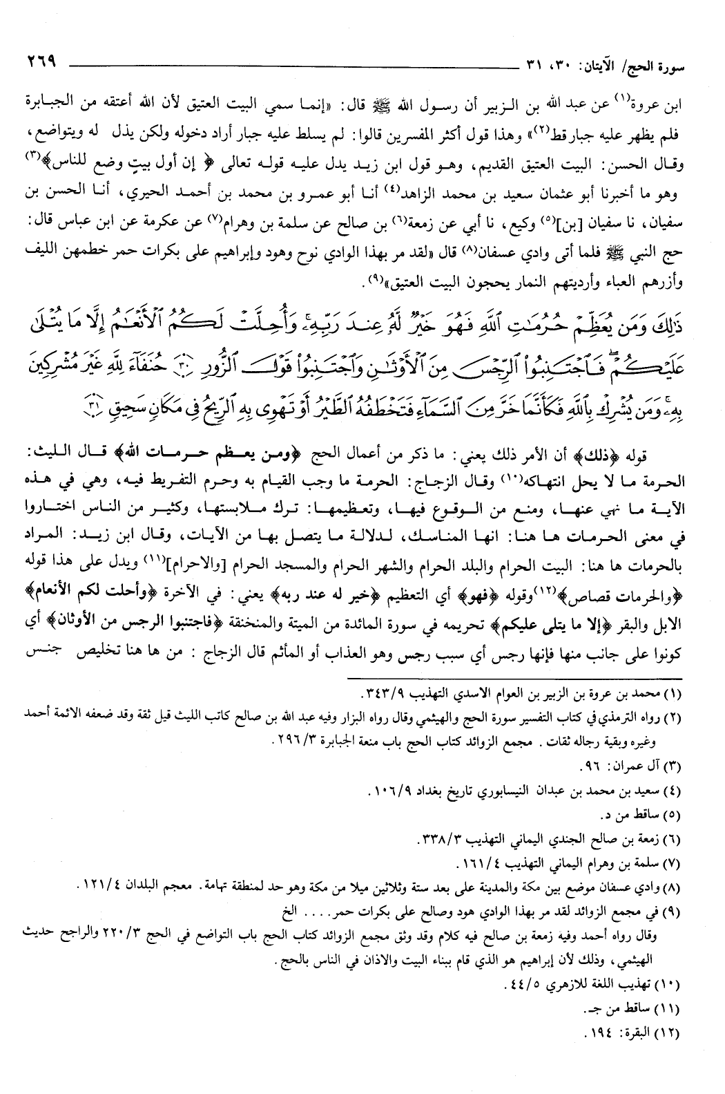 {ذَلِكَ وَمَنْ يُعَظِّمْ حُرُمَاتِ اللَّهِ فَهُوَ خَيْرٌ لَهُ عِنْدَ رَبِّهِ وَأُحِلَّتْ لَكُمُ الأَنْعَامُ إِلا مَا يُتْلَى عَلَيْكُمْ فَاجْتَنِبُوا الرِّجْسَ مِنَ الأَوْثَانِ وَاجْتَنِبُوا قَوْلَ الزُّورِ {30} حُنَفَاءَ لِلَّهِ غَيْرَ مُشْرِكِينَ بِهِ وَمَنْ يُشْرِكْ بِاللَّهِ فَكَأَنَّمَا خَرَّ مِنَ السَّمَاءِ فَتَخْطَفُهُ الطَّيْرُ أَوْ تَهْوِي بِهِ الرِّيحُ فِي مَكَانٍ سَحِيقٍ {31} } [الحج: 30-31] قوله: ذلك أن الأمر ذلك، يعني: ما ذكر من أعمال الحج {وَمَنْ يُعَظِّمْ حُرُمَاتِ اللَّهِ} [الحج: 30] قال الليث: الحرمة ما لا يحل انتهاكه.
