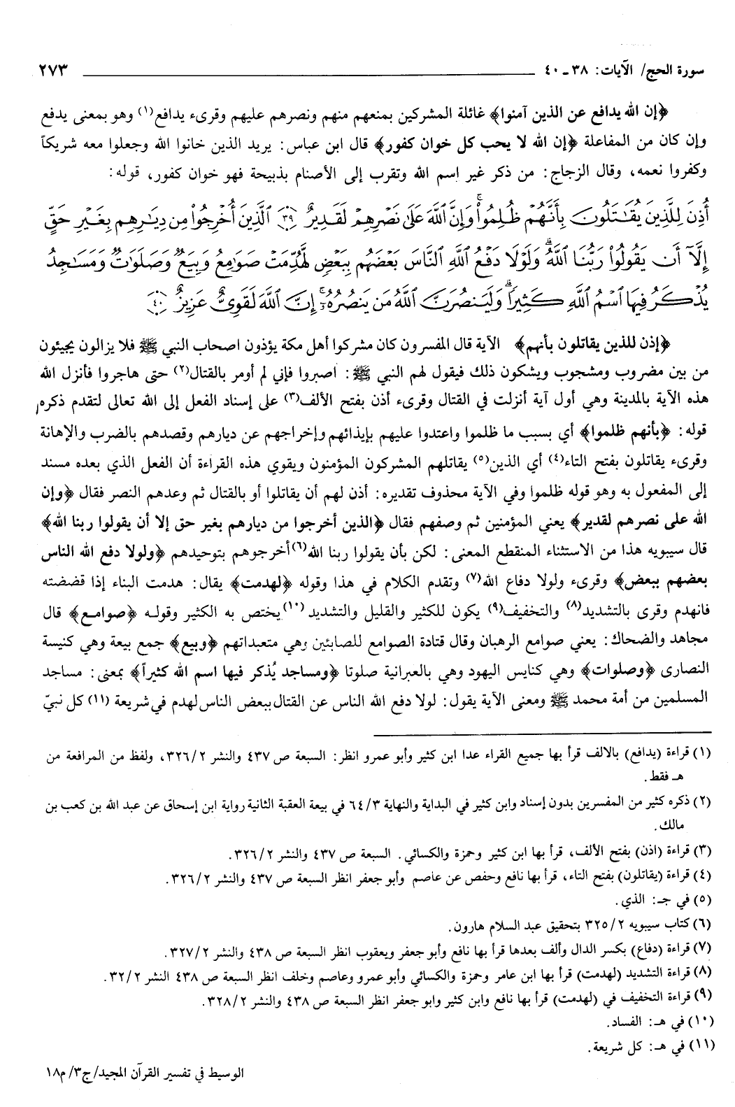 قوله: {أُذِنَ لِلَّذِينَ يُقَاتَلُونَ بِأَنَّهُمْ ظُلِمُوا وَإِنَّ اللَّهَ عَلَى نَصْرِهِمْ لَقَدِيرٌ {39} الَّذِينَ أُخْرِجُوا مِنْ دِيَارِهِمْ بِغَيْرِ حَقٍّ إِلا أَنْ يَقُولُوا رَبُّنَا اللَّهُ وَلَوْلا دَفْعُ اللَّهِ النَّاسَ بَعْضَهُمْ بِبَعْضٍ لَهُدِّمَتْ صَوَامِعُ وَبِيَعٌ وَصَلَوَاتٌ وَمَسَاجِدُ يُذْكَرُ فِيهَا اسْمُ اللَّهِ كَثِيرًا وَلَيَنْصُرَنَّ اللَّهُ مَنْ يَنْصُرُهُ إِنَّ اللَّهَ لَقَوِيٌّ عَزِيزٌ {40} } [الحج: 39-40] {أُذِنَ لِلَّذِينَ يُقَاتَلُونَ بِأَنَّهُمْ} [الحج: 39] الآية، قال المفسرون: كان مشركوا أهل مكة يؤذون أصحاب النبي صَلَّى اللهُ عَلَيْهِ وَسَلَّمَ، فلا يزالون يجيئون من بين مضروب ومشجون ويشكون ذلك، فيقول لهم النبي صَلَّى اللهُ عَلَيْهِ وَسَلَّمَ: «اصبروا فإني لم أومر بالقتال» .