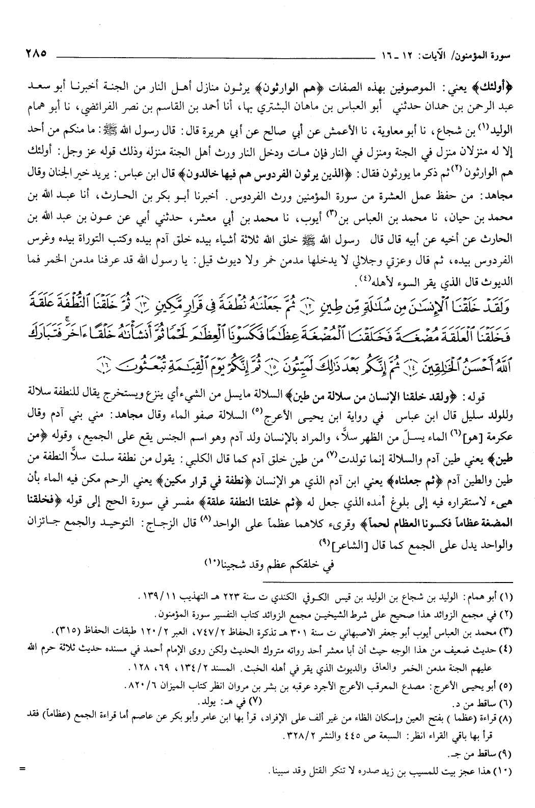 {وَلَقَدْ خَلَقْنَا الإِنْسَانَ مِنْ سُلالَةٍ مِنْ طِينٍ {12} ثُمَّ جَعَلْنَاهُ نُطْفَةً فِي قَرَارٍ مَكِينٍ {13} ثُمَّ خَلَقْنَا النُّطْفَةَ عَلَقَةً فَخَلَقْنَا الْعَلَقَةَ مُضْغَةً فَخَلَقْنَا الْمُضْغَةَ عِظَامًا فَكَسَوْنَا الْعِظَامَ لَحْمًا ثُمَّ أَنْشَأْنَاهُ خَلْقًا آخَرَ فَتَبَارَكَ اللَّهُ أَحْسَنُ الْخَالِقِينَ {14} ثُمَّ إِنَّكُمْ بَعْدَ ذَلِكَ لَمَيِّتُونَ {15} ثُمَّ إِنَّكُمْ يَوْمَ الْقِيَامَةِ تُبْعَثُونَ {16} } [المؤمنون: 12-16] قوله: {وَلَقَدْ خَلَقْنَا الإِنْسَانَ مِنْ سُلالَةٍ مِنْ طِينٍ} [المؤمنون: 12] السلالة ما يسل من الشيء، أي ينزع ويستخرج، يقال للنطفة سلالة، وللولد سليل، قال ابن عباس في رواية ابن يحيى الأعرج: السلالة صفو الماء.