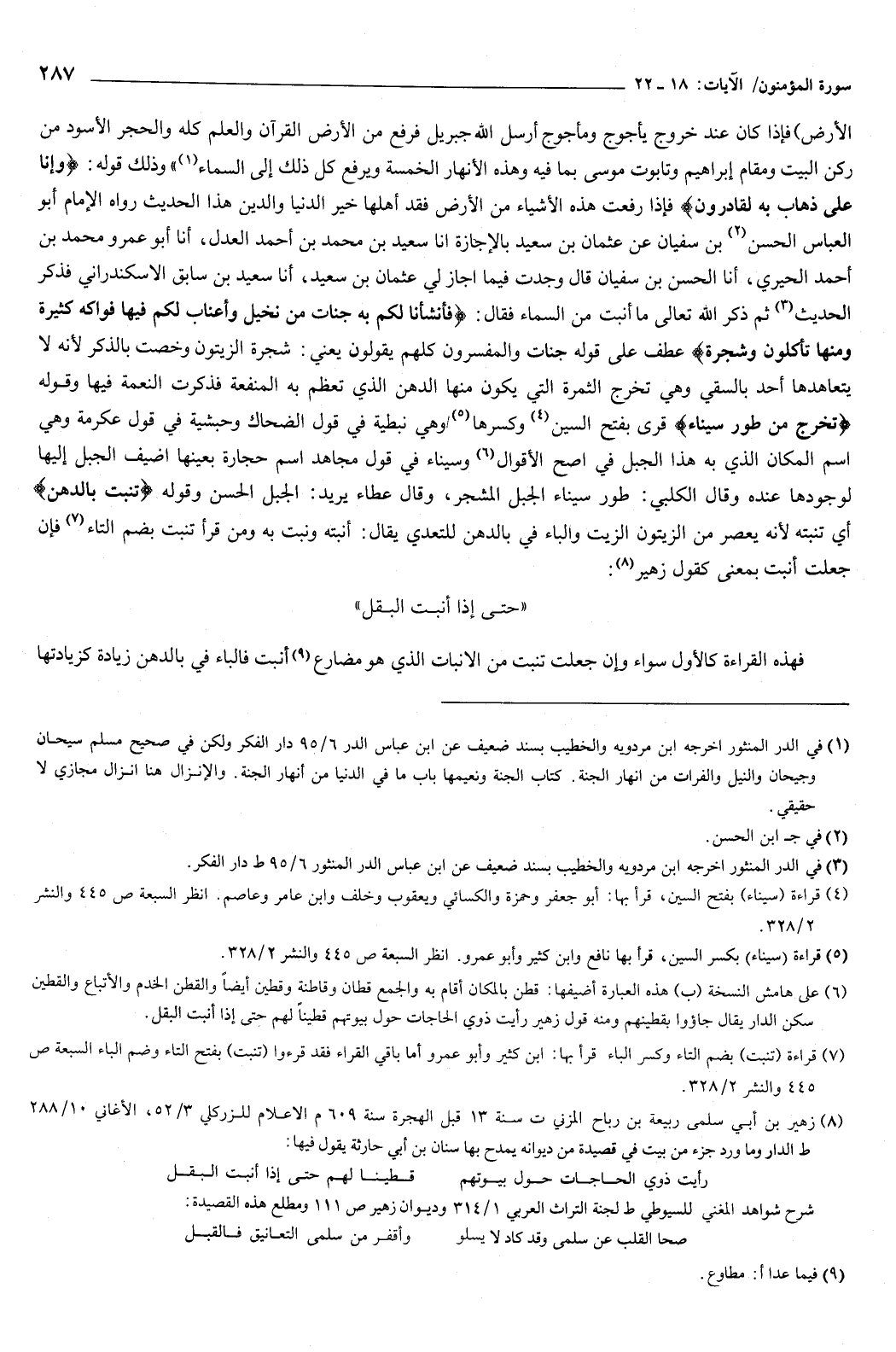 فِي الأَرْضِ وَإِنَّا عَلَى ذَهَابٍ بِهِ لَقَادِرُونَ {18} فَأَنْشَأْنَا لَكُمْ بِهِ جَنَّاتٍ مِنْ نَخِيلٍ وَأَعْنَابٍ لَكُمْ فِيهَا فَوَاكِهُ كَثِيرَةٌ وَمِنْهَا تَأْكُلُونَ {19} وَشَجَرَةً تَخْرُجُ مِنْ طُورِ سَيْنَاءَ تَنْبُتُ بِالدُّهْنِ وَصِبْغٍ لِلآكِلِينَ {20} وَإِنَّ لَكُمْ فِي الأَنْعَامِ لَعِبْرَةً نُسْقِيكُمْ مِمَّا فِي بُطُونِهَا وَلَكُمْ فِيهَا مَنَافِعُ كَثِيرَةٌ وَمِنْهَا تَأْكُلُونَ {21} وَعَلَيْهَا وَعَلَى الْفُلْكِ تُحْمَلُونَ {22} } [المؤمنون: 18-22] {وَأَنْزَلْنَا مِنَ السَّمَاءِ مَاءً بِقَدَرٍ} [المؤمنون: 18] أي: بقدر يعلمه الله، وقال مقاتل: بقدر ما يكفيهم للمعيشة.