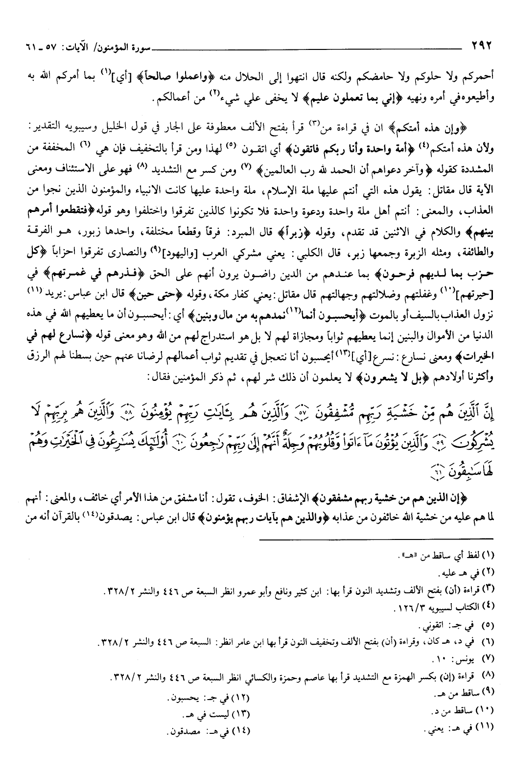 ثم ذكر المؤمنين فقال: {إِنَّ الَّذِينَ هُمْ مِنْ خَشْيَةِ رَبِّهِمْ مُشْفِقُونَ {57} وَالَّذِينَ هُمْ بِآيَاتِ رَبِّهِمْ يُؤْمِنُونَ {58} وَالَّذِينَ هُمْ بِرَبِّهِمْ لا يُشْرِكُونَ {59} وَالَّذِينَ يُؤْتُونَ مَا آتَوْا وَقُلُوبُهُمْ وَجِلَةٌ أَنَّهُمْ إِلَى رَبِّهِمْ رَاجِعُونَ {60} أُولَئِكَ يُسَارِعُونَ فِي الْخَيْرَاتِ وَهُمْ لَهَا سَابِقُونَ {61} } [المؤمنون: 57-61] {إِنَّ الَّذِينَ هُمْ مِنْ خَشْيَةِ رَبِّهِمْ مُشْفِقُونَ} [المؤمنون: 57] الإشفاق الخوف، تقول: أنا مشفق من هذا الأمر، أي خائف.
