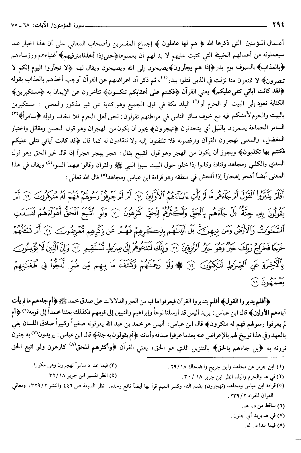 أعمال المؤمنين التي ذكرها الله، {هُمْ لَهَا عَامِلُونَ} [المؤمنون: 63] إجماع المفسرين، وأصحاب المعاني على أن هذا إخبار عما سيعملونه من أعمالهم الخبيثة التي كتبت عليهم، لابد لهم أن يعملوها، {حَتَّى إِذَا أَخَذْنَا مُتْرَفِيهِمْ} [المؤمنون: 64] أغنياءهم ورؤساهم، {بِالْعَذَابِ} [المؤمنون: 64] بالسيوف يوم بدر، {إِذَا هُمْ يَجْأَرُونَ} [المؤمنون: 64] يصيحون إلى الله، ويصيحون ويقال لهم: {لا تَجْأَرُوا الْيَوْمَ إِنَّكُمْ مِنَّا لا تُنْصَرُونَ} [المؤمنون: 65] لا تمنعون منا، نزلت في الذين قتلوا ببدر، ثم ذكر أن إعراضهم عن القرآن أوجب أخذهم بالعذاب بقوله: {قَدْ كَانَتْ آيَاتِي تُتْلَى عَلَيْكُمْ} [المؤمنون: 66] يعني القرآن، {فَكُنْتُمْ عَلَى أَعْقَابِكُمْ تَنْكِصُونَ} [المؤمنون: 66] تتأخرون عن الإيمان به، {مُسْتَكْبِرِينَ} [المؤمنون: 67] الكناية تعود إلى البيت، أو الحرم، أو البلد مكة في قول الجميع، وهو كناية عن غير مذكور، والمعنى: مستكبرين بالبيت والحرم لأمنكم فيه مع خوف سائر الناس في مواطنهم، تقولون: نحن أهل الحرم فلا نخاف.