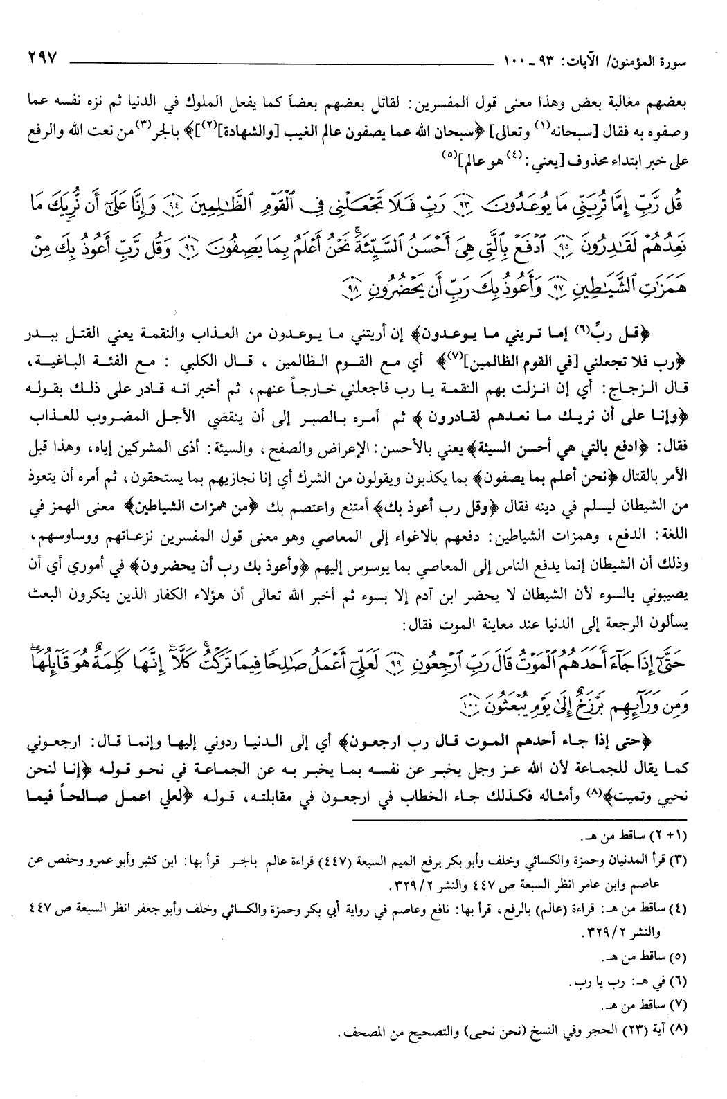 {قُلْ رَبِّ إِمَّا تُرِيَنِّي مَا يُوعَدُونَ {93} رَبِّ فَلا تَجْعَلْنِي فِي الْقَوْمِ الظَّالِمِينَ {94} وَإِنَّا عَلَى أَنْ نُرِيَكَ مَا نَعِدُهُمْ لَقَادِرُونَ {95} ادْفَعْ بِالَّتِي هِيَ أَحْسَنُ السَّيِّئَةَ نَحْنُ أَعْلَمُ بِمَا يَصِفُونَ {96} وَقُلْ رَبِّ أَعُوذُ بِكَ مِنْ هَمَزَاتِ الشَّيَاطِينِ {97} وَأَعُوذُ بِكَ رَبِّ أَنْ يَحْضُرُونِ {98} } [المؤمنون: 93-98] {قُلْ رَبِّ إِمَّا تُرِيَنِّي مَا يُوعَدُونَ} [المؤمنون: 93] إن أريتني ما يوعدون من العذاب والنقمة، يعني القتل ببدر.