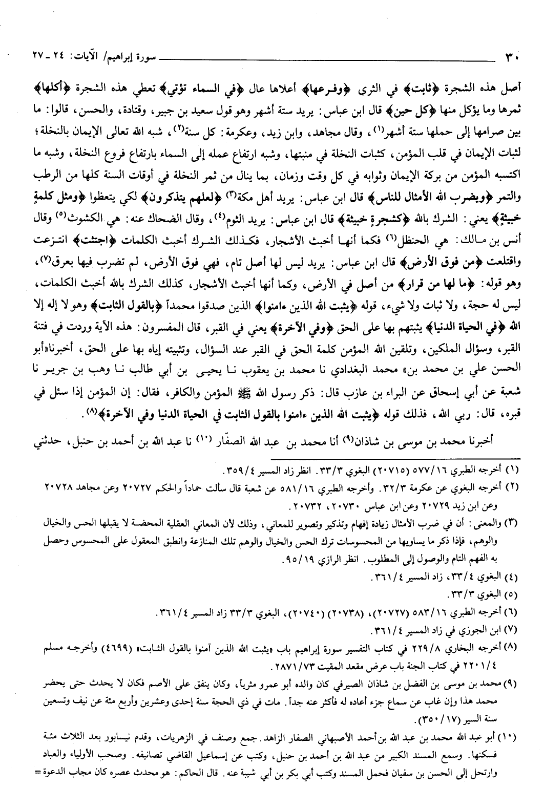 قوله {يُثَبِّتُ اللَّهُ الَّذِينَ آمَنُوا} [إبراهيم: 27] الذين صدقوا محمدا، {بِالْقَوْلِ الثَّابِتِ} [إبراهيم: 27] وهو لا إله إلا الله، {فِي الْحَيَاةِ الدُّنْيَا} [إبراهيم: 27] يثبتهم بها على الحق، {وَفِي الآخِرَةِ} [إبراهيم: 27] يعني في القبر، قال المفسرون: هذه الآية وردت في فتنة القبر، وسؤال الملكين، وتلقين الله المؤمن كلمة الحق في القبر عند السؤال، وتثبيته إياه بها على الحق.