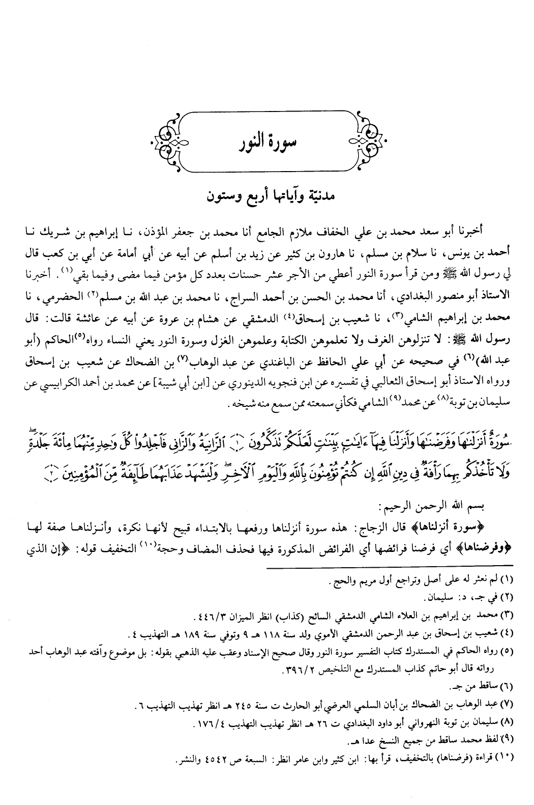 {سُورَةٌ أَنْزَلْنَاهَا وَفَرَضْنَاهَا وَأَنْزَلْنَا فِيهَا آيَاتٍ بَيِّنَاتٍ لَعَلَّكُمْ تَذَكَّرُونَ {1} الزَّانِيَةُ وَالزَّانِي فَاجْلِدُوا كُلَّ وَاحِدٍ مِنْهُمَا مِائَةَ جَلْدَةٍ وَلا تَأْخُذْكُمْ بِهِمَا رَأْفَةٌ فِي دِينِ اللَّهِ إِنْ كُنْتُمْ تُؤْمِنُونَ بِاللَّهِ وَالْيَوْمِ الآخِرِ وَلْيَشْهَدْ عَذَابَهُمَا طَائِفَةٌ مِنَ الْمُؤْمِنِينَ {2} } [النور: 1-2] بسم الله الرحمن الرحيم {سُورَةٌ أَنْزَلْنَاهَا} [النور: 1] قال الزجاج: هذه { [أنزلناها، ورفعها بالابتداء قبيح لأنها نكرة، وأنزلناها صفة لها.