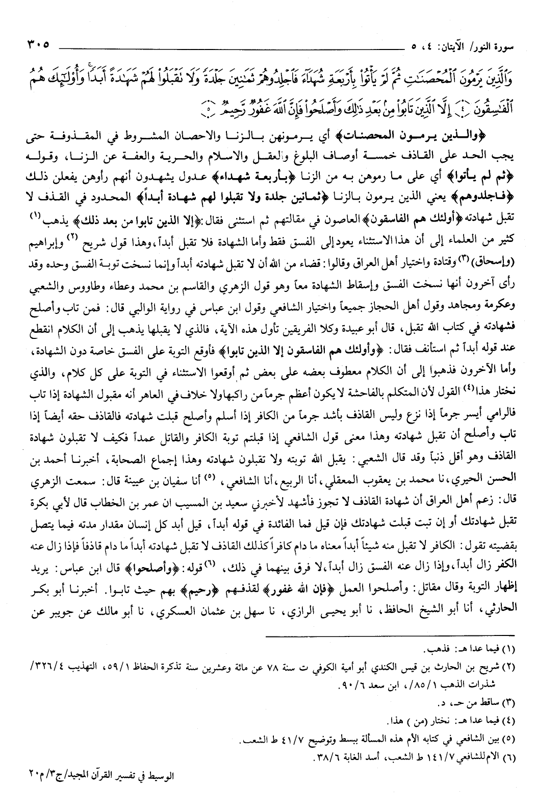 وَالَّذِينَ يَرْمُونَ الْمُحْصَنَاتِ ثُمَّ لَمْ يَأْتُوا بِأَرْبَعَةِ شُهَدَاءَ فَاجْلِدُوهُمْ ثَمَانِينَ جَلْدَةً وَلا تَقْبَلُوا لَهُمْ شَهَادَةً أَبَدًا وَأُولَئِكَ هُمُ الْفَاسِقُونَ {4} إِلا الَّذِينَ تَابُوا مِنْ بَعْدِ ذَلِكَ وَأَصْلَحُوا فَإِنَّ اللَّهَ غَفُورٌ رَحِيمٌ {5} } [النور: 4-5] {وَالَّذِينَ يَرْمُونَ الْمُحْصَنَاتِ} [النور: 4] أي: يرمونهن بالزنا، والإحصان المشروط في المقذوفة حتى يجب الحد على القاذف خمسة أوصاف: البلوغ، والعقل، والإسلام، والحرية، والعفة عن الزنا.