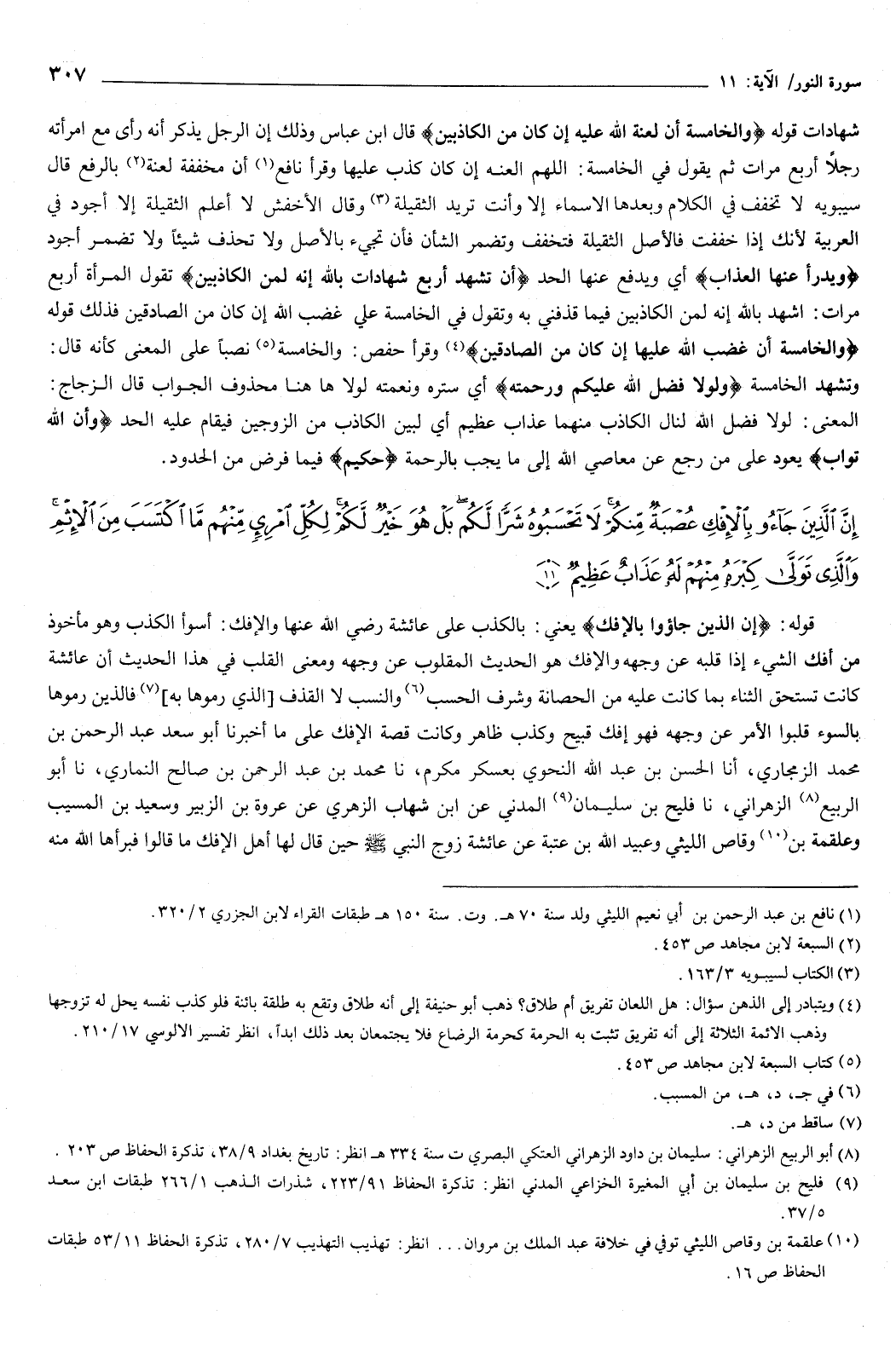 {إِنَّ الَّذِينَ جَاءُوا بِالإِفْكِ عُصْبَةٌ مِنْكُمْ لا تَحْسَبُوهُ شَرًّا لَكُمْ بَلْ هُوَ خَيْرٌ لَكُمْ لِكُلِّ امْرِئٍ مِنْهُمْ مَا اكْتَسَبَ مِنَ الإِثْمِ وَالَّذِي تَوَلَّى كِبْرَهُ مِنْهُمْ لَهُ عَذَابٌ عَظِيمٌ} [النور: 11] قوله: {إِنَّ الَّذِينَ جَاءُوا بِالإِفْكِ} [النور: 11] يعني: بالكذب على عائشة رضي الله عنها، والإفك: أسوأ الكذب، وهو مأخوذ من أفك الشيء إذا قلبه عن وجهه، والإفك هو الحديث المقلوب عن وجهه، ومعنى القلب في هذا الحديث أن عائشة كانت تستحق الثناء بما كانت عليه من الحصانة وشرف الحسب والنسب لا القذف الذي رموها به، فالذين رموها بالسوء قلبوا الأمر عن وجهه، فهو إفك قبيح، وكذب ظاهر، وكانت قصة الإفك على ما: