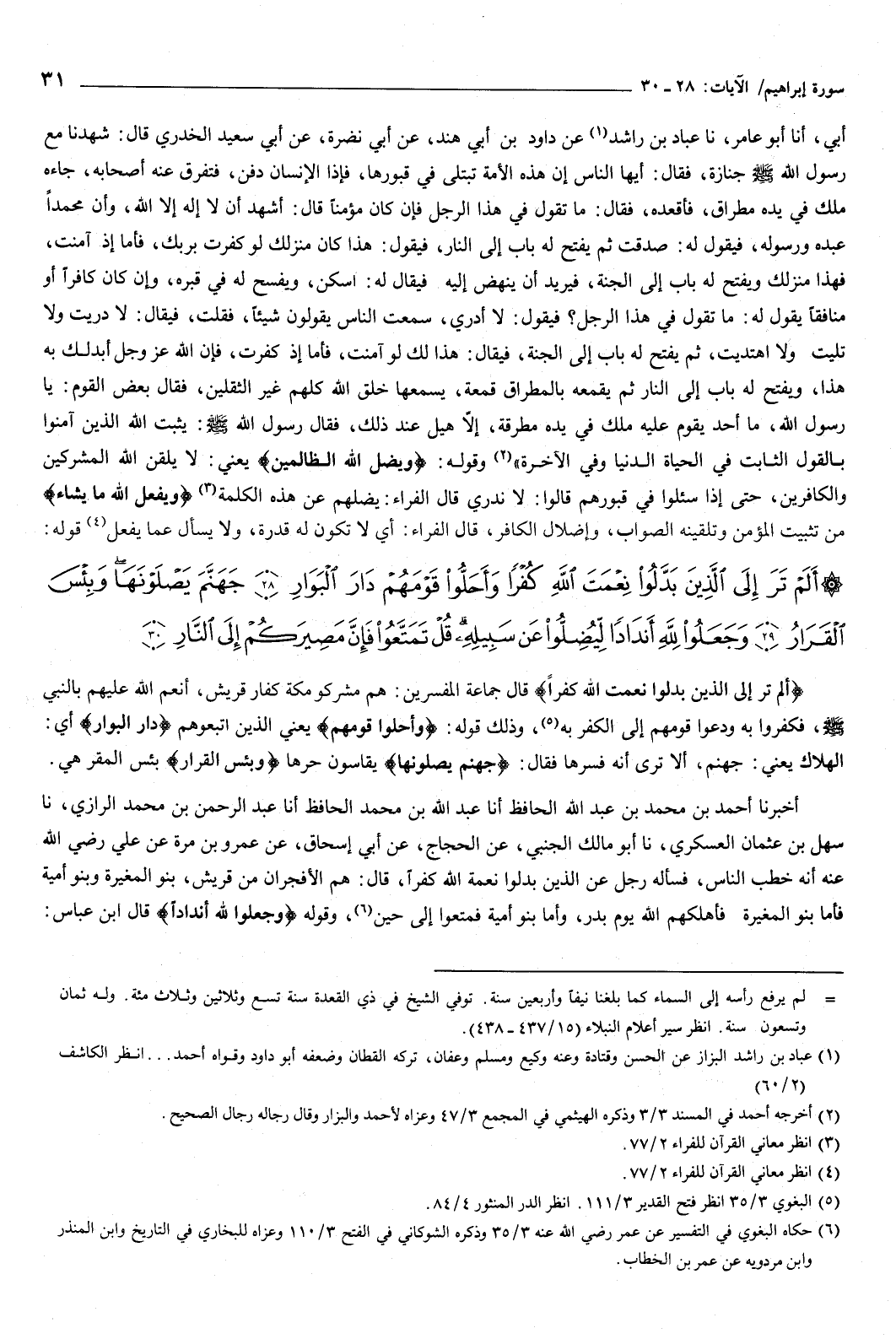 قوله: {أَلَمْ تَرَ إِلَى الَّذِينَ بَدَّلُوا نِعْمَتَ اللَّهِ كُفْرًا وَأَحَلُّوا قَوْمَهُمْ دَارَ الْبَوَارِ {28} جَهَنَّمَ يَصْلَوْنَهَا وَبِئْسَ الْقَرَارُ {29} وَجَعَلُوا لِلَّهِ أَنْدَادًا لِيُضِلُّوا عَنْ سَبِيلِهِ قُلْ تَمَتَّعُوا فَإِنَّ مَصِيرَكُمْ إِلَى النَّارِ {30} } [إبراهيم: 28-30] {أَلَمْ تَرَ إِلَى الَّذِينَ بَدَّلُوا نِعْمَتَ اللَّهِ كُفْرًا} [إبراهيم: 28] قال جماعة المفسرين: هم مشركو مكة كفار قريش، أنعم الله عليهم بالنبي صَلَّى اللهُ عَلَيْهِ وَسَلَّمَ، فكفروا به، ودعوا قومهم إلى الكفر به، وذلك قوله: وأحلوا قومهم يعني الذين اتبعوهم، {دَارَ الْبَوَارِ} [إبراهيم: 28] أي الهلاك، يعني جهنم، ألا ترى أنه فسرها، فقال: جهنم يصلونها يقاسون حرها، وبئس القرار بئس المقر هي.