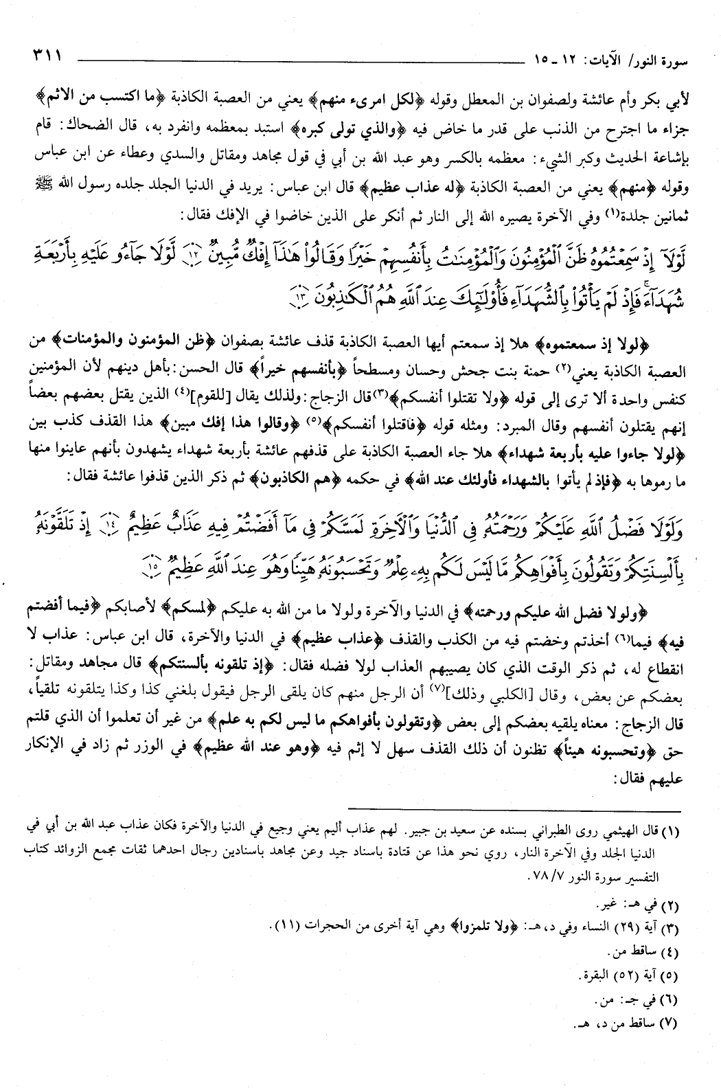 ثم أنكر على الذين خاضوا في الإفك، فقال: {لَوْلا إِذْ سَمِعْتُمُوهُ ظَنَّ الْمُؤْمِنُونَ وَالْمُؤْمِنَاتُ بِأَنْفُسِهِمْ خَيْرًا وَقَالُوا هَذَا إِفْكٌ مُبِينٌ {12} لَوْلا جَاءُوا عَلَيْهِ بِأَرْبَعَةِ شُهَدَاءَ فَإِذْ لَمْ يَأْتُوا بِالشُّهَدَاءِ فَأُولَئِكَ عِنْدَ اللَّهِ هُمُ الْكَاذِبُونَ {13} } [النور: 12-13] {لَوْلا إِذْ سَمِعْتُمُوهُ} [النور: 12] هلا إذ سمعتم أيها العصبة الكاذبة قذف عائشة بصفوان، {ظَنَّ الْمُؤْمِنُونَ وَالْمُؤْمِنَاتُ} [النور: 12] من العصبة الكاذبة، يعني: حمنة بنت جحش، وحسان، ومسطحا، {بِأَنْفُسِهِمْ خَيْرًا} [النور: 12] قال الحسن: بأهل دينهم، لأن المؤمنين كنفس واحدة، ألا ترى إلى قوله: {وَلا تَقْتُلُوا أَنْفُسَكُمْ} [النساء: 29] .