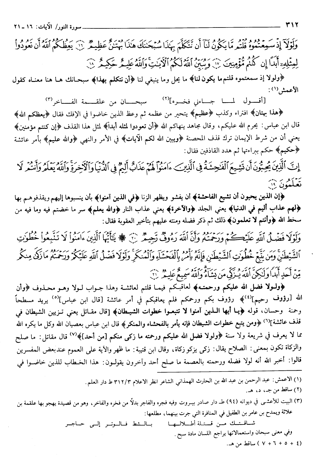 وَلَوْلا إِذْ سَمِعْتُمُوهُ قُلْتُمْ مَا يَكُونُ لَنَا أَنْ نَتَكَلَّمَ بِهَذَا سُبْحَانَكَ هَذَا بُهْتَانٌ عَظِيمٌ {16} يَعِظُكُمُ اللَّهُ أَنْ تَعُودُوا لِمِثْلِهِ أَبَدًا إِنْ كُنْتُمْ مُؤْمِنِينَ {17} وَيُبَيِّنُ اللَّهُ لَكُمُ الآيَاتِ وَاللَّهُ عَلِيمٌ حَكِيمٌ {18} } [النور: 16-18] {وَلَوْلا إِذْ سَمِعْتُمُوهُ قُلْتُمْ مَا يَكُونُ لَنَا} [النور: 16] ما يحل وما ينبغي لنا، {أَنْ نَتَكَلَّمَ بِهَذَا} [النور: 16] ، سبحانك ههنا معناه كقول الأعمش: