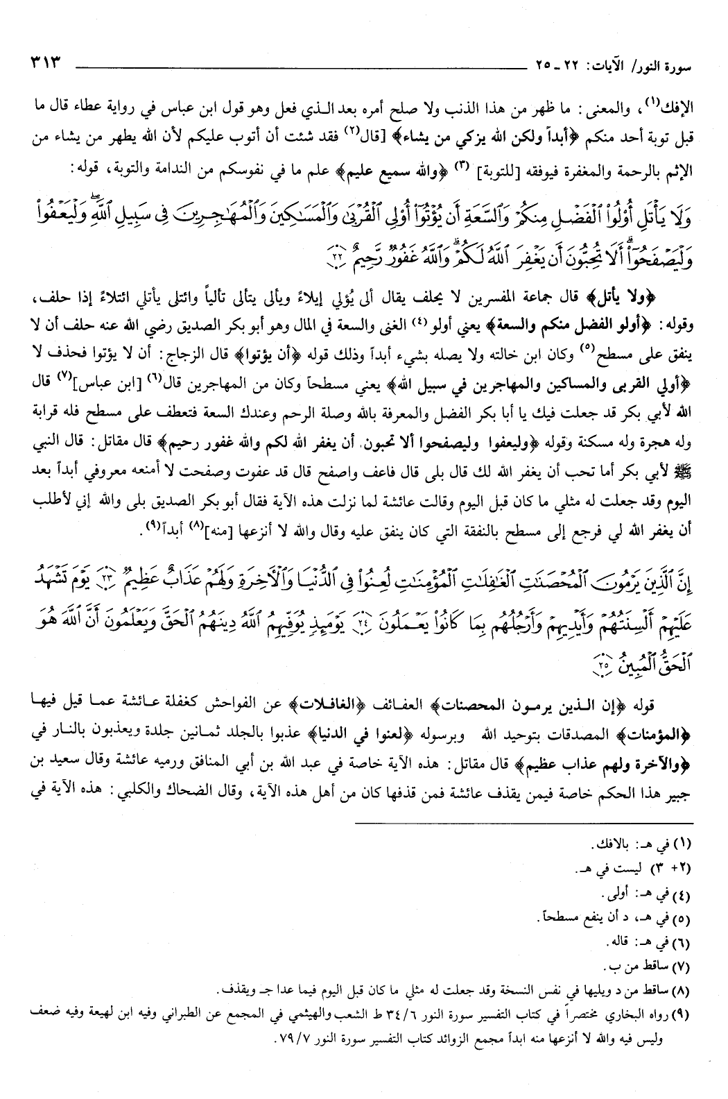 {أُولِي الْقُرْبَى وَالْمَسَاكِينَ وَالْمُهَاجِرِينَ فِي سَبِيلِ اللَّهِ} [النور: 22] يعني مسطحًا، وكان من المهاجرين، قال ابن عباس: قال الله لأبي بكر: قد جعلت فيك يا أبا بكر الفضل والمعرفة بالله وصلة الرحم، وعندك السعة، فتعطف على مسطح، فله قرابة، وله هجرة، وله مسكنة.