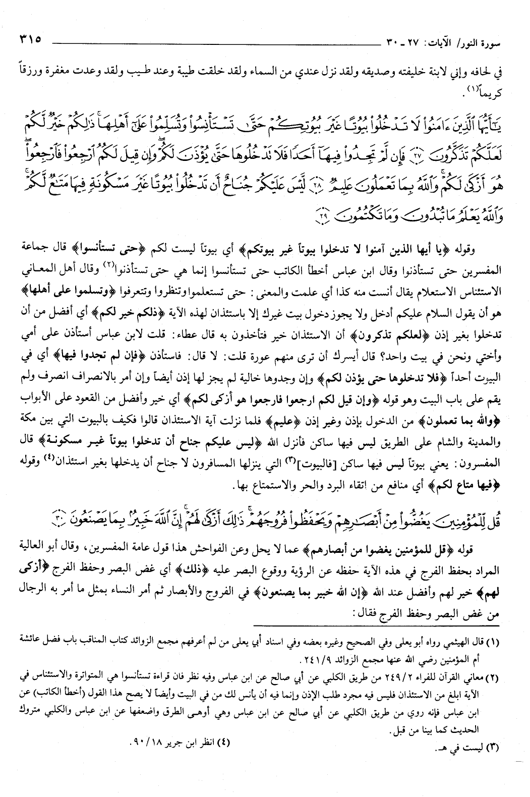 {يَأَيُّهَا الَّذِينَ آمَنُوا لا تَدْخُلُوا بُيُوتًا غَيْرَ بُيُوتِكُمْ حَتَّى تَسْتَأْنِسُوا وَتُسَلِّمُوا عَلَى أَهْلِهَا ذَلِكُمْ خَيْرٌ لَكُمْ لَعَلَّكُمْ تَذَكَّرُونَ {27} فَإِنْ لَمْ تَجِدُوا فِيهَا أَحَدًا فَلا تَدْخُلُوهَا حَتَّى يُؤْذَنَ لَكُمْ وَإِنْ قِيلَ لَكُمُ ارْجِعُوا فَارْجِعُوا هُوَ أَزْكَى لَكُمْ وَاللَّهُ بِمَا تَعْمَلُونَ عَلِيمٌ {28} لَيْسَ عَلَيْكُمْ جُنَاحٌ أَنْ تَدْخُلُوا بُيُوتًا غَيْرَ مَسْكُونَةٍ فِيهَا مَتَاعٌ لَكُمْ وَاللَّهُ يَعْلَمُ مَا تُبْدُونَ وَمَا تَكْتُمُونَ {29} } [النور: 27-29] وقوله: {يَأَيُّهَا الَّذِينَ آمَنُوا لا تَدْخُلُوا بُيُوتًا غَيْرَ بُيُوتِكُمْ} [النور: 27] أي: بيوتا ليست لكم، {حَتَّى تَسْتَأْنِسُوا} [النور: 27] قال جماعة المفسرين: حتى تستأذنوا.