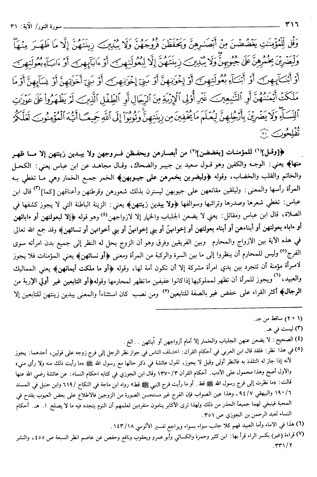 وَقُلْ لِلْمُؤْمِنَاتِ يَغْضُضْنَ مِنْ أَبْصَارِهِنَّ وَيَحْفَظْنَ فُرُوجَهُنَّ وَلا يُبْدِينَ زِينَتَهُنَّ إِلا مَا ظَهَرَ مِنْهَا وَلْيَضْرِبْنَ بِخُمُرِهِنَّ عَلَى جُيُوبِهِنَّ وَلا يُبْدِينَ زِينَتَهُنَّ إِلا لِبُعُولَتِهِنَّ أَوْ آبَائِهِنَّ أَوْ آبَاءِ بُعُولَتِهِنَّ أَوْ أَبْنَائِهِنَّ أَوْ أَبْنَاءِ بُعُولَتِهِنَّ أَوْ إِخْوَانِهِنَّ أَوْ بَنِي إِخْوَانِهِنَّ أَوْ بَنِي أَخَوَاتِهِنَّ أَوْ نِسَائِهِنَّ أَوْ مَا مَلَكَتْ أَيْمَانُهُنَّ أَوِ التَّابِعِينَ غَيْرِ أُولِي الإِرْبَةِ مِنَ الرِّجَالِ أَوِ الطِّفْلِ الَّذِينَ لَمْ يَظْهَرُوا عَلَى عَوْرَاتِ النِّسَاءِ وَلا يَضْرِبْنَ بِأَرْجُلِهِنَّ لِيُعْلَمَ مَا يُخْفِينَ مِنْ زِينَتِهِنَّ وَتُوبُوا إِلَى اللَّهِ جَمِيعًا أَيُّهَا الْمُؤْمِنُونَ لَعَلَّكُمْ تُفْلِحُونَ} [النور: 31] {وَقُلْ لِلْمُؤْمِنَاتِ يَغْضُضْنَ مِنْ أَبْصَارِهِنَّ وَيَحْفَظْنَ فُرُوجَهُنَّ وَلا يُبْدِينَ زِينَتَهُنَّ إِلا مَا ظَهَرَ مِنْهَا} [النور: 31] يعني: الوجه والكفين، وهو قول سعيد بن جبير، والضحاك.