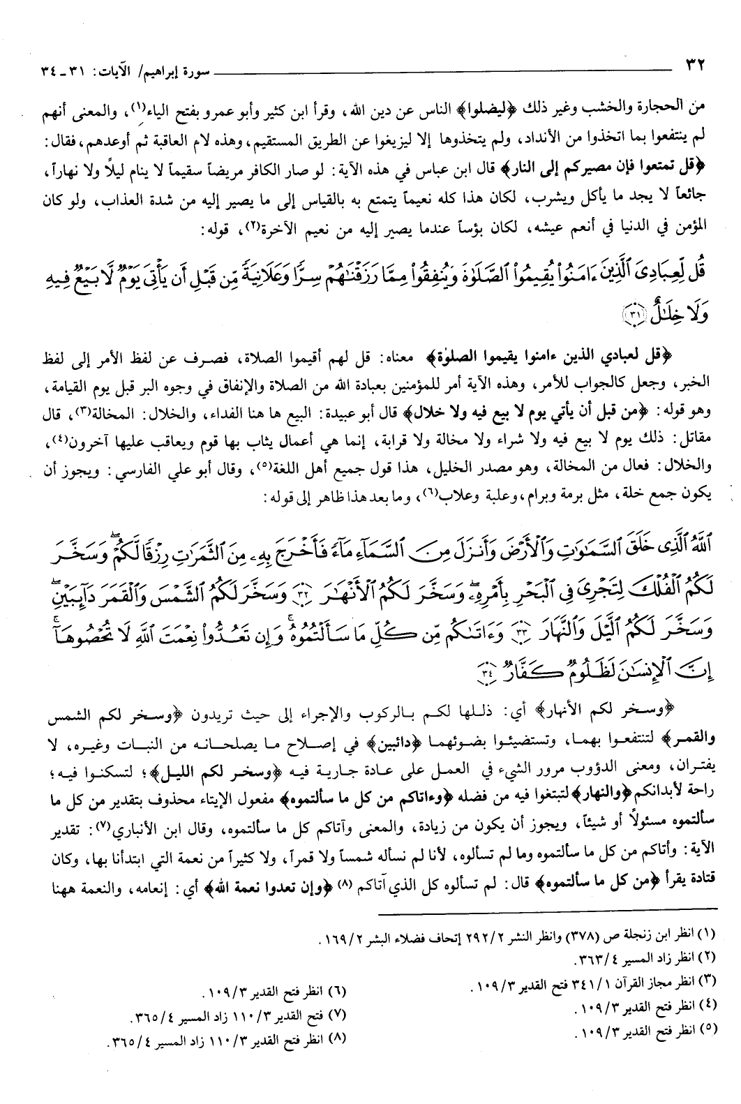 قوله: {قُلْ لِعِبَادِيَ الَّذِينَ آمَنُوا يُقِيمُوا الصَّلاةَ وَيُنْفِقُوا مِمَّا رَزَقْنَاهُمْ سِرًّا وَعَلانِيَةً مِنْ قَبْلِ أَنْ يَأْتِيَ يَوْمٌ لا بَيْعٌ فِيهِ وَلا خِلالٌ} [إبراهيم: 31] {قُلْ لِعِبَادِيَ الَّذِينَ آمَنُوا يُقِيمُوا الصَّلاةَ} [إبراهيم: 31] معناه: قل لهم أقيموا الصلاة، فصرف عن لفظ الأمر إلى لفظ الخبر، وجعل كالجواب للأمر، وهذه الآية أمر للمؤمنين بعبادة الله من الصلاة والإنفاق في وجوه البر قبل يوم القيامة، وهو قوله: {مِنْ قَبْلِ أَنْ يَأْتِيَ يَوْمٌ لا بَيْعٌ فِيهِ وَلا خِلالٌ} [إبراهيم: 31] قال أبو عبيدة: البيع ههنا الفداء، والخلال: المخالة.