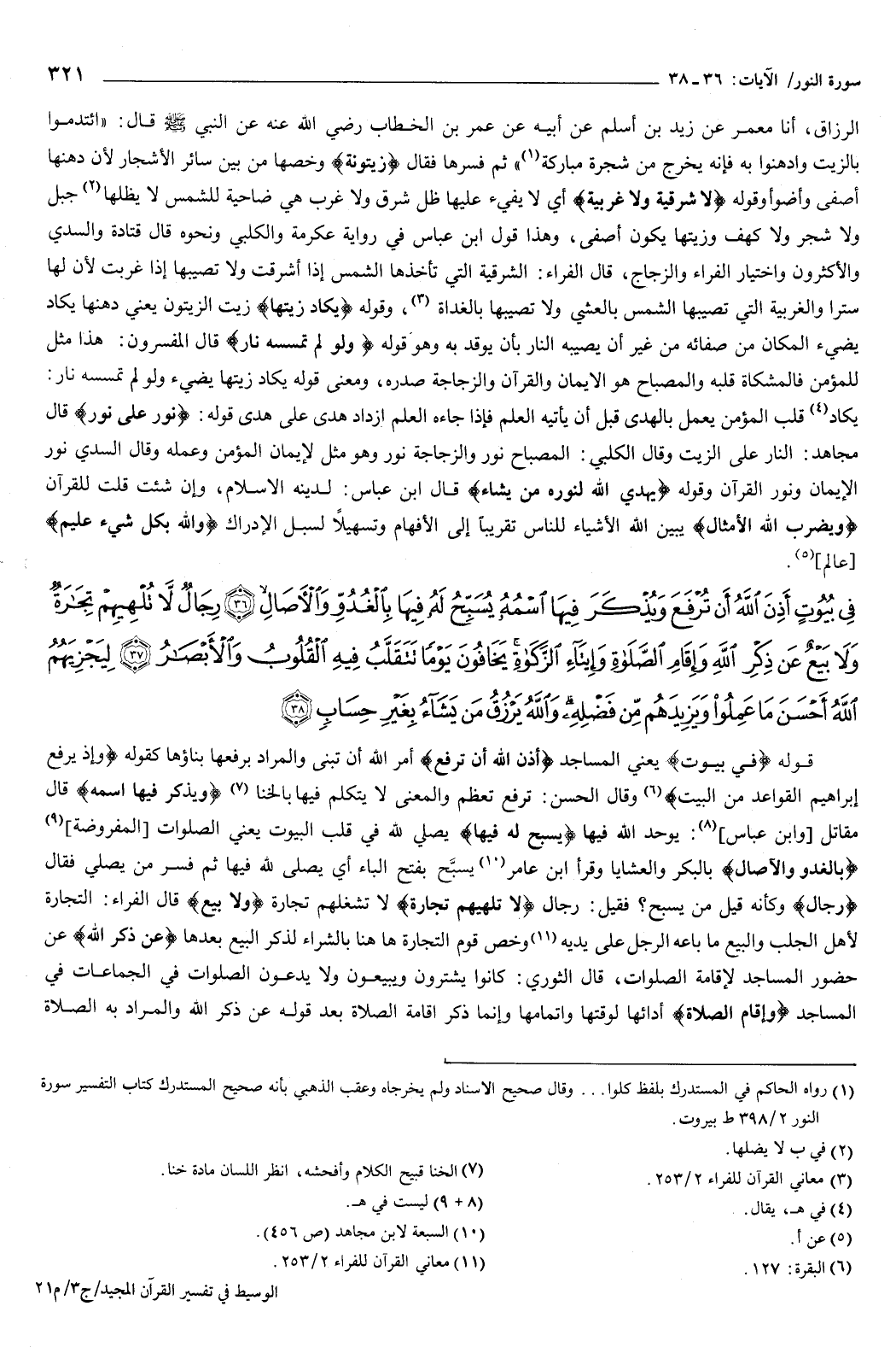 {فِي بُيُوتٍ أَذِنَ اللَّهُ أَنْ تُرْفَعَ وَيُذْكَرَ فِيهَا اسْمُهُ يُسَبِّحُ لَهُ فِيهَا بِالْغُدُوِّ وَالآصَالِ {36} رِجَالٌ لا تُلْهِيهِمْ تِجَارَةٌ وَلا بَيْعٌ عَنْ ذِكْرِ اللَّهِ وَإِقَامِ الصَّلاةِ وَإِيتَاءِ الزَّكَاةِ يَخَافُونَ يَوْمًا تَتَقَلَّبُ فِيهِ الْقُلُوبُ وَالأَبْصَارُ {37} لِيَجْزِيَهُمُ اللَّهُ أَحْسَنَ مَا عَمِلُوا وَيَزِيدَهُمْ مِنْ فَضْلِهِ وَاللَّهُ يَرْزُقُ مَنْ يَشَاءُ بِغَيْرِ حِسَابٍ {38} } [النور: 36-38] قوله: {فِي بُيُوتٍ} [النور: 36] يعني المساجد، {أَذِنَ اللَّهُ أَنْ تُرْفَعَ} [النور: 36] أمر الله أن تبنى، والمراد برفعها بناؤها، كقوله: {وَإِذْ يَرْفَعُ إِبْرَاهِيمُ الْقَوَاعِدَ مِنَ الْبَيْتِ} [البقرة: 127] وقال الحسن: ترفع تعظم.
