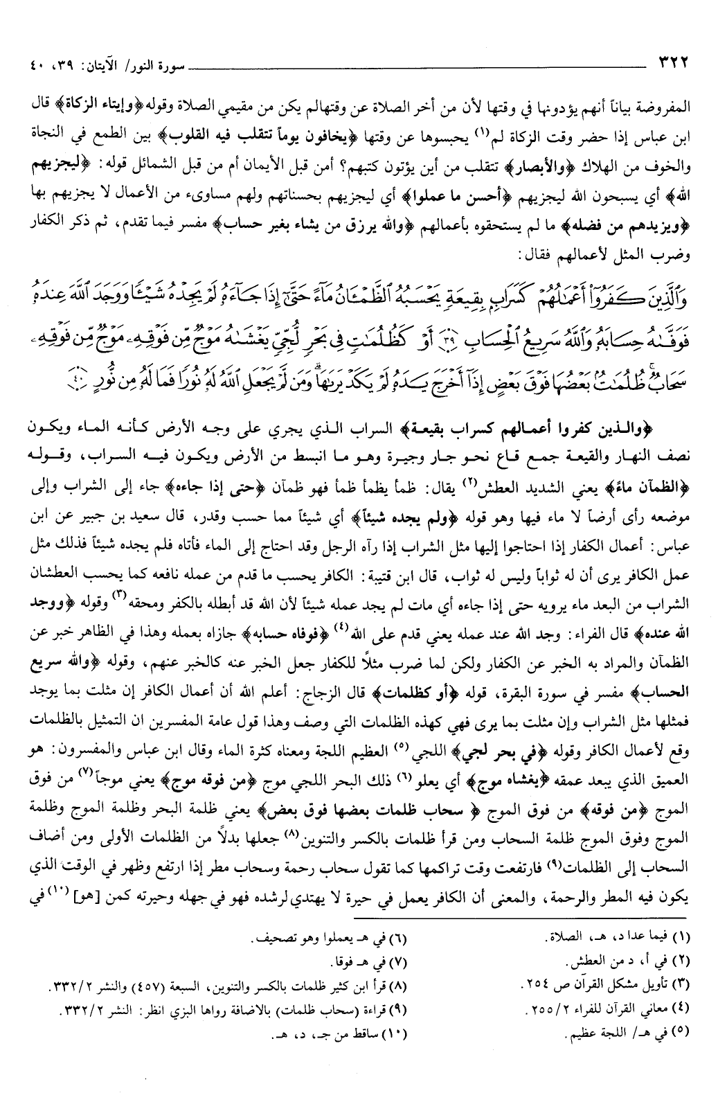 {فَوَفَّاهُ حِسَابَهُ} [النور: 39] جازاه بعمله، وهذا في الظاهر خبر عن الظمآن، والمراد به الخبر عن الكفار، ولكن لما ضرب مثلا للكفار جعل الخبر عنه كالخبر عنهم، وقوله: {وَاللَّهُ سَرِيعُ الْحِسَابِ} [النور: 39] مفسر في { [البقرة.
