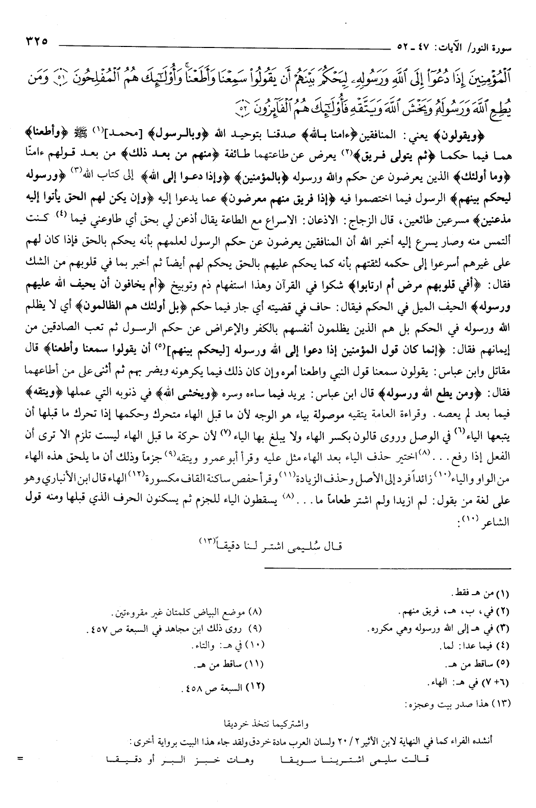 الْمُؤْمِنِينَ إِذَا دُعُوا إِلَى اللَّهِ وَرَسُولِهِ لِيَحْكُمَ بَيْنَهُمْ أَنْ يَقُولُوا سَمِعْنَا وَأَطَعْنَا وَأُولَئِكَ هُمُ الْمُفْلِحُونَ {51} وَمَنْ يُطِعِ اللَّهَ وَرَسُولَهُ وَيَخْشَ اللَّهَ وَيَتَّقْهِ فَأُولَئِكَ هُمُ الْفَائِزُونَ {52} } [النور: 47-52] {وَيَقُولُونَ} [النور: 47] يعني المنافقين، {آمَنَّا بِاللَّهِ} [النور: 47] صدقنا بتوحيد الله، {وَبِالرَّسُولِ} [النور: 47] محمد صَلَّى اللهُ عَلَيْهِ وَسَلَّمَ، {وَأَطَعْنَا} [النور: 47] هما فيما حكما، {ثُمَّ يَتَوَلَّى فَرِيقٌ} [النور: 47] يعرض عن طاعتهما طائفة، {مِنْهُمْ مِنْ بَعْدِ ذَلِكَ} [النور: 47] من بعد قولهم آمنا، {وَمَا أُولَئِكَ} [النور: 47] الذين يعرضون عن حكم الله ورسوله، {بِالْمُؤْمِنِينَ} [النور: 47] .