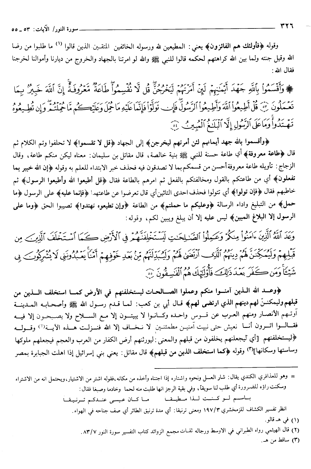 فقال الله: {وَأَقْسَمُوا بِاللَّهِ جَهْدَ أَيْمَانِهِمْ لَئِنْ أَمَرْتَهُمْ لَيَخْرُجُنَّ قُلْ لا تُقْسِمُوا طَاعَةٌ مَعْرُوفَةٌ إِنَّ اللَّهَ خَبِيرٌ بِمَا تَعْمَلُونَ {53} قُلْ أَطِيعُوا اللَّهَ وَأَطِيعُوا الرَّسُولَ فَإِنْ تَوَلَّوْا فَإِنَّمَا عَلَيْهِ مَا حُمِّلَ وَعَلَيْكُمْ مَا حُمِّلْتُمْ وَإِنْ تُطِيعُوهُ تَهْتَدُوا وَمَا عَلَى الرَّسُولِ إِلا الْبَلاغُ الْمُبِينُ {54} } [النور: 53-54] {وَأَقْسَمُوا بِاللَّهِ جَهْدَ أَيْمَانِهِمْ لَئِنْ أَمَرْتَهُمْ لَيَخْرُجُنَّ} [النور: 53] إلى الجهاد، {قُلْ لا تُقْسِمُوا} [النور: 53] لا تحلفوا، وتم الكلام، ثم قال: {طَاعَةٌ مَعْرُوفَةٌ} [النور: 53] أي: طاعة حسنة للنبي صَلَّى اللهُ عَلَيْهِ وَسَلَّمَ بنيه خالصة، قال مقاتل بن سليمان: معناه ليكن منكم طاعة.