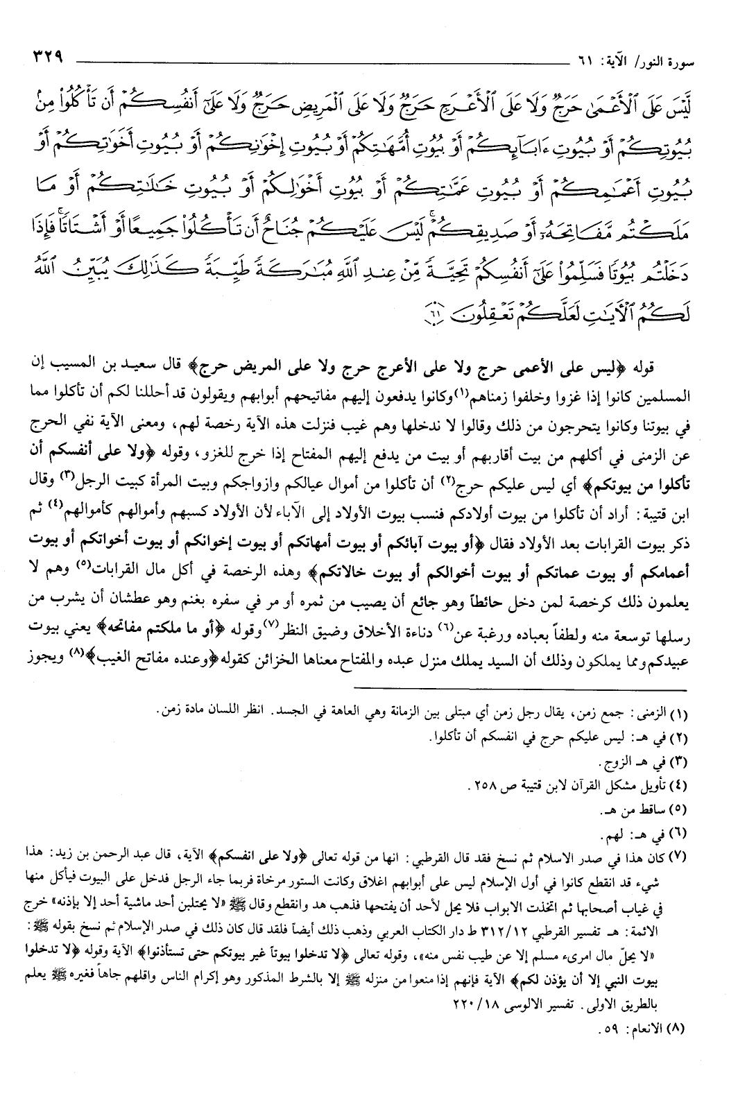 {لَيْسَ عَلَى الأَعْمَى حَرَجٌ وَلا عَلَى الأَعْرَجِ حَرَجٌ وَلا عَلَى الْمَرِيضِ حَرَجٌ وَلا عَلَى أَنْفُسِكُمْ أَنْ تَأْكُلُوا مِنْ بُيُوتِكُمْ أَوْ بُيُوتِ آبَائِكُمْ أَوْ بُيُوتِ أُمَّهَاتِكُمْ أَوْ بُيُوتِ إِخْوَانِكُمْ أَوْ بُيُوتِ أَخَوَاتِكُمْ أَوْ بُيُوتِ أَعْمَامِكُمْ أَوْ بُيُوتِ عَمَّاتِكُمْ أَوْ بُيُوتِ أَخْوَالِكُمْ أَوْ بُيُوتِ خَالاتِكُمْ أَوْ مَا مَلَكْتُمْ مَفَاتِحَهُ أَوْ صَدِيقِكُمْ لَيْسَ عَلَيْكُمْ جُنَاحٌ أَنْ تَأْكُلُوا جَمِيعًا أَوْ أَشْتَاتًا فَإِذَا دَخَلْتُمْ بُيُوتًا فَسَلِّمُوا عَلَى أَنْفُسِكُمْ تَحِيَّةً مِنْ عِنْدِ اللَّهِ مُبَارَكَةً طَيِّبَةً كَذَلِكَ يُبَيِّنُ اللَّهُ لَكُمُ الآيَاتِ لَعَلَّكُمْ تَعْقِلُونَ} [النور: 61] قوله: {لَيْسَ عَلَى الأَعْمَى حَرَجٌ وَلا عَلَى الأَعْرَجِ حَرَجٌ وَلا عَلَى الْمَرِيضِ حَرَجٌ} [النور: 61] قال سعيد بن المسيب: إن المسلمين كانوا إذا غزوا وخلفوا زمناهم، وكانوا يدفعون إليهم مفاتيحهم أبوابهم، ويقولون: قد أحللنا لكم أن تأكلوا مما في بيوتنا.