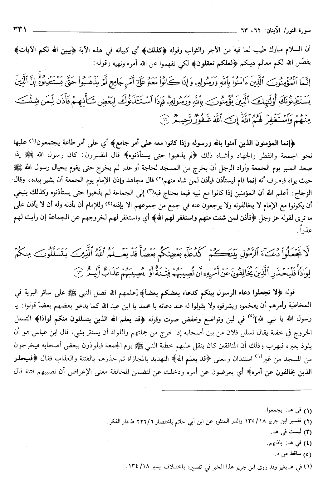 وقوله: {إِنَّمَا الْمُؤْمِنُونَ الَّذِينَ آمَنُوا بِاللَّهِ وَرَسُولِهِ وَإِذَا كَانُوا مَعَهُ عَلَى أَمْرٍ جَامِعٍ لَمْ يَذْهَبُوا حَتَّى يَسْتَأْذِنُوهُ إِنَّ الَّذِينَ يَسْتَأْذِنُونَكَ أُولَئِكَ الَّذِينَ يُؤْمِنُونَ بِاللَّهِ وَرَسُولِهِ فَإِذَا اسْتَأْذَنُوكَ لِبَعْضِ شَأْنِهِمْ فَأْذَنْ لِمَنْ شِئْتَ مِنْهُمْ وَاسْتَغْفِرْ لَهُمُ اللَّهَ إِنَّ اللَّهَ غَفُورٌ رَحِيمٌ} [النور: 62] {إِنَّمَا الْمُؤْمِنُونَ الَّذِينَ آمَنُوا بِاللَّهِ وَرَسُولِهِ وَإِذَا كَانُوا مَعَهُ عَلَى أَمْرٍ جَامِعٍ} [النور: 62] أي: على أمر طاعة يجتمعون عليها، نحو الجمعة، والفطر، والجهاد، وأشباه ذلك.