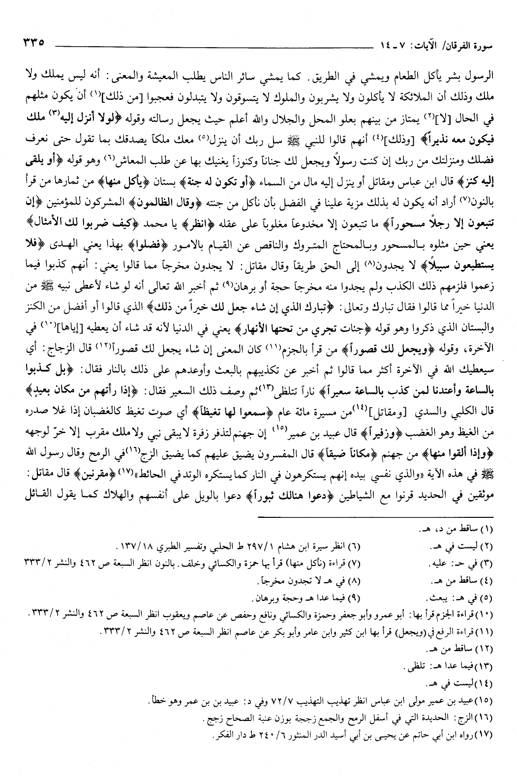 وقوله: {لَوْلا أُنْزِلَ إِلَيْهِ مَلَكٌ فَيَكُونَ مَعَهُ نَذِيرًا} [الفرقان: 7] وذلك أنهم قالوا للنبي صَلَّى اللهُ عَلَيْهِ وَسَلَّمَ: سل ربك أن ينزل معك ملكا يصدقك بما تقول حتى نعرف فضلك ومنزلتك من ربك إن كنت رسولا، ويجعل لك جنانا وكنوزا يغنيك بها عن طلب المعاش.