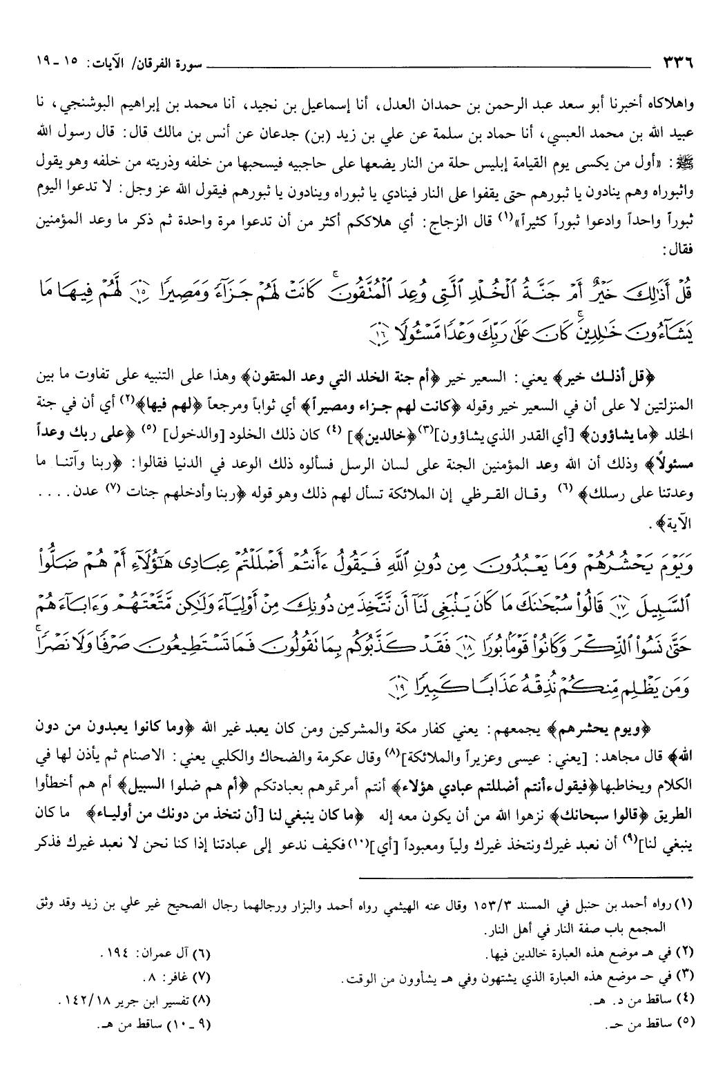 {وَيَوْمَ يَحْشُرُهُمْ وَمَا يَعْبُدُونَ مِنْ دُونِ اللَّهِ فَيَقُولُ أَأَنْتُمْ أَضْلَلْتُمْ عِبَادِي هَؤُلاءِ أَمْ هُمْ ضَلُّوا السَّبِيلَ {17} قَالُوا سُبْحَانَكَ مَا كَانَ يَنْبَغِي لَنَا أَنْ نَتَّخِذَ مِنْ دُونِكَ مِنْ أَوْلِيَاءَ وَلَكِنْ مَتَّعْتَهُمْ وَآبَاءَهُمْ حَتَّى نَسُوا الذِّكْرَ وَكَانُوا قَوْمًا بُورًا {18} فَقَدْ كَذَّبُوكُمْ بِمَا تَقُولُونَ فَمَا تَسْتَطِيعُونَ صَرْفًا وَلا نَصْرًا وَمَنْ يَظْلِمْ مِنْكُمْ نُذِقْهُ عَذَابًا كَبِيرًا {19} } [الفرقان: 17-19] {وَيَوْمَ يَحْشُرُهُمْ} [الفرقان: 17] يجمعهم يعني: كفار مكة والمشركين، ومن كان يعبد غير الله، {وَمَا يَعْبُدُونَ مِنْ دُونِ اللَّهِ} [الفرقان: 17] قال مجاهد: يعني عيسى وعزيرا والملائكة.