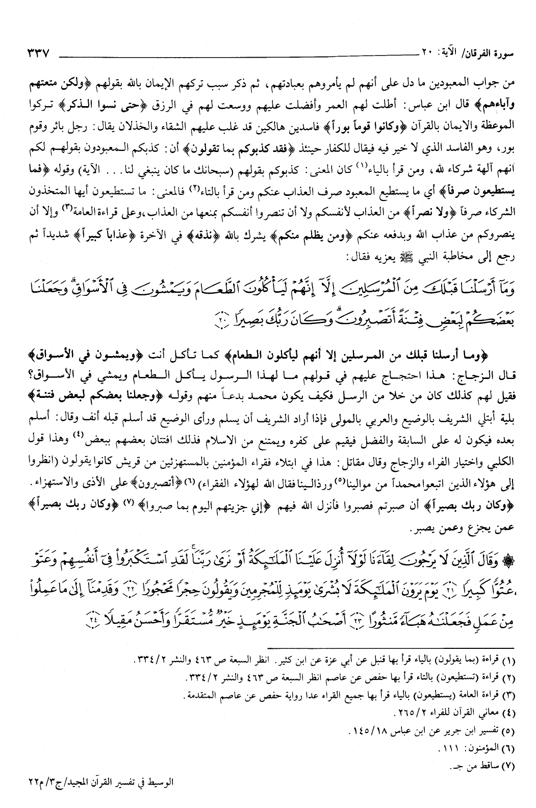 {وَكَانَ رَبُّكَ بَصِيرًا} [الفرقان: 20] أن صبرتم فصبروا، فأنزل الله فيهم {إِنِّي جَزَيْتُهُمُ الْيَوْمَ بِمَا صَبَرُوا} [المؤمنون: 111] ، {وَكَانَ رَبُّكَ بَصِيرًا} [الفرقان: 20] عمن يجزع وعمن يصبر.