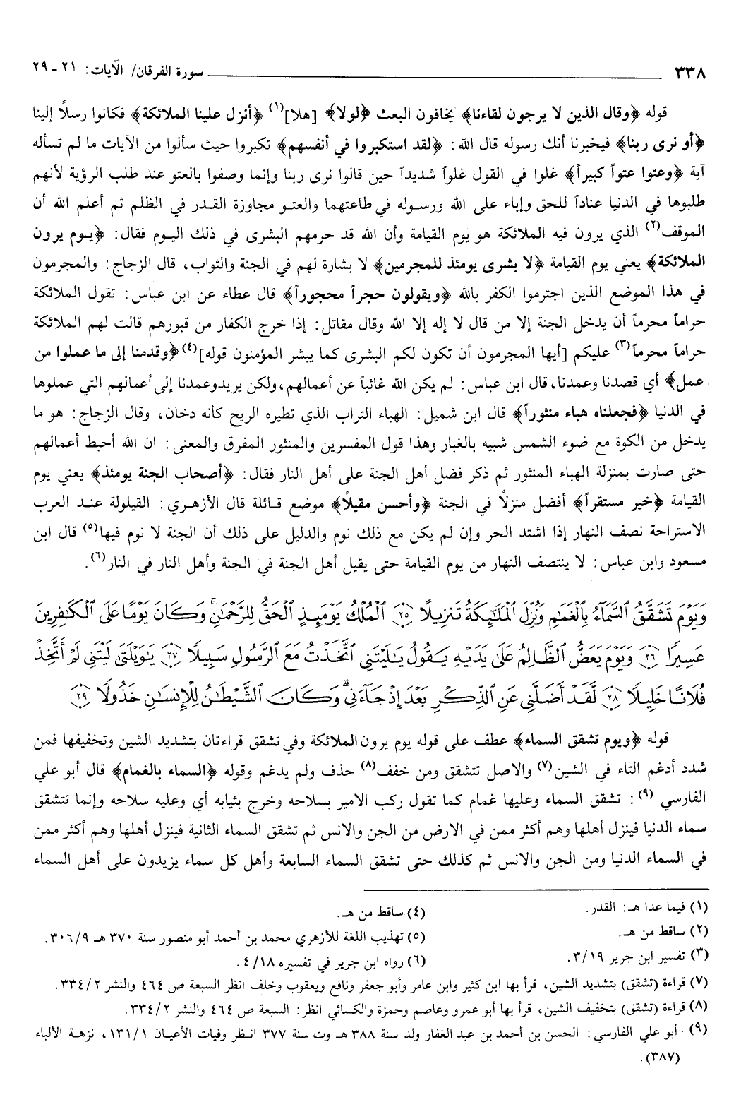 {وَيَوْمَ تَشَقَّقُ السَّمَاءُ بِالْغَمَامِ وَنُزِّلَ الْمَلائِكَةُ تَنْزِيلا {25} الْمُلْكُ يَوْمَئِذٍ الْحَقُّ لِلرَّحْمَنِ وَكَانَ يَوْمًا عَلَى الْكَافِرِينَ عَسِيرًا {26} وَيَوْمَ يَعَضُّ الظَّالِمُ عَلَى يَدَيْهِ يَقُولُ يَا لَيْتَنِي اتَّخَذْتُ مَعَ الرَّسُولِ سَبِيلا {27} يَا وَيْلَتَى لَيْتَنِي لَمْ أَتَّخِذْ فُلانًا خَلِيلا {28} لَقَدْ أَضَلَّنِي عَنِ الذِّكْرِ بَعْدَ إِذْ جَاءَنِي وَكَانَ الشَّيْطَانُ لِلإِنْسَانِ خَذُولا {29} } [الفرقان: 25-29] قوله: {وَيَوْمَ تَشَقَّقُ السَّمَاءُ} [الفرقان: 25] عطف على قوله: {يَوْمَ يَرَوْنَ الْمَلائِكَةَ} [الفرقان: 22] وفي تشقق قراءتان: بتشديد الشين، وتخفيفها، فمن شدد أدغم التاء في الشين، والأصل تتشقق، ومن خفف حذف ولم يدغم.