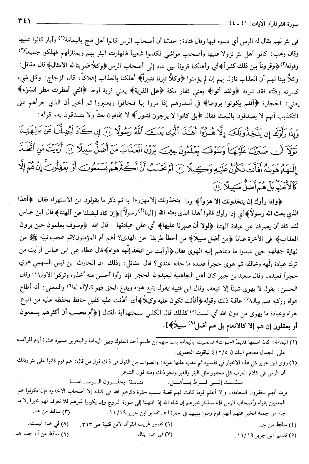 {لَوْلا أَنْ صَبَرْنَا عَلَيْهَا} [الفرقان: 42] أي: على عبادتها، قال الله: {وَسَوْفَ يَعْلَمُونَ حِينَ يَرَوْنَ الْعَذَابَ} [الفرقان: 42] في الآخرة عيانا، {مَنْ أَضَلُّ سَبِيلا} [الفرقان: 42] من أخطأ طريقا عن الهدى، أهم أم المؤمنون؟ ثم عجب نبيه صَلَّى اللهُ عَلَيْهِ وَسَلَّمَ من نهاية جهلهم حين عبدوا ما دعاهم إليه الهوى، فقال: {أَرَأَيْتَ مَنِ اتَّخَذَ إِلَهَهُ هَوَاهُ} [الفرقان: 43] قال عطاء، عن ابن عباس: أرأيت من ترك عبادة إلهه وخالفه، ثم هوى حجرا فعبده، ما حاله عندي؟ قال مقاتل: وذلك إن الحارث بن قيس السهمي هوي حجرا فعبده.