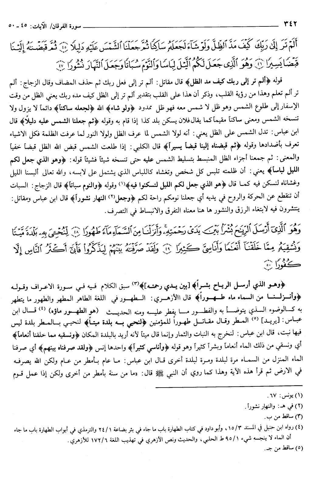{وَهُوَ الَّذِي أَرْسَلَ الرِّيَاحَ بُشْرًا بَيْنَ يَدَيْ رَحْمَتِهِ وَأَنْزَلْنَا مِنَ السَّمَاءِ مَاءً طَهُورًا {48} لِنُحْيِيَ بِهِ بَلْدَةً مَيْتًا وَنُسْقِيَهُ مِمَّا خَلَقْنَا أَنْعَامًا وَأَنَاسِيَّ كَثِيرًا {49} وَلَقَدْ صَرَّفْنَاهُ بَيْنَهُمْ لِيَذَّكَّرُوا فَأَبَى أَكْثَرُ النَّاسِ إِلا كُفُورًا {50} } [الفرقان: 48-50] {وَهُوَ الَّذِي أَرْسَلَ الرِّيَاحَ بُشْرًا بَيْنَ يَدَيْ رَحْمَتِهِ} [الفرقان: 48] سبق الكلام فيه في { [الأعراف وقوله:] وَأَنْزَلْنَا مِنَ السَّمَاءِ مَاءً طَهُورًا} [سورة الفرقان: 48] قال الأزهري: الطهور في اللغة الطاهر المطهر، والطهور ما يتطهر به، كالوضوء الذي يتوضأ به، والفطور ما يفطر عليه، ومنه الحديث: «هو الطهور ماؤه» .