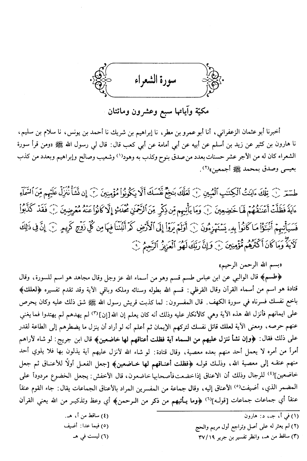 {طسم {1} تِلْكَ آيَاتُ الْكِتَابِ الْمُبِينِ {2} لَعَلَّكَ بَاخِعٌ نَفْسَكَ أَلَّا يَكُونُوا مُؤْمِنِينَ {3} إِنْ نَشَأْ نُنَزِّلْ عَلَيْهِمْ مِنَ السَّمَاءِ آيَةً فَظَلَّتْ أَعْنَاقُهُمْ لَهَا خَاضِعِينَ {4} وَمَا يَأْتِيهِمْ مِنْ ذِكْرٍ مِنَ الرَّحْمَنِ مُحْدَثٍ إِلا كَانُوا عَنْهُ مُعْرِضِينَ {5} فَقَدْ كَذَّبُوا فَسَيَأْتِيهِمْ أَنْبَاءُ مَا كَانُوا بِهِ يَسْتَهْزِءُونَ {6} أَوَلَمْ يَرَوْا إِلَى الأَرْضِ كَمْ أَنْبَتْنَا فِيهَا مِنْ كُلِّ زَوْجٍ كَرِيمٍ {7} إِنَّ فِي ذَلِكَ لآيَةً وَمَا كَانَ أَكْثَرُهُمْ مُؤْمِنِينَ {8} وَإِنَّ رَبَّكَ لَهُوَ الْعَزِيزُ الرَّحِيمُ {9} } [الشعراء: 1-9] بسم الله الرحمن الرحيم {طسم} [الشعراء: 1] قال الوالبي، عن ابن عباس: {طسم} [الشعراء: 1] قسم، وهو من أسماء الله عز وجل.