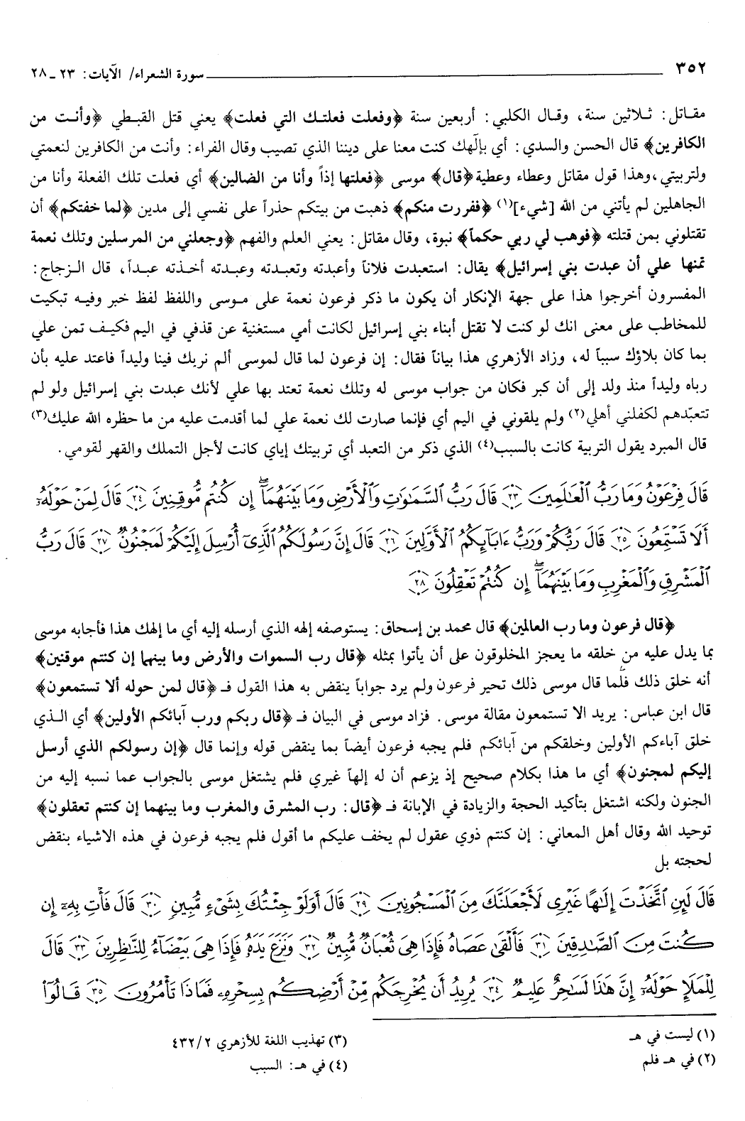 {قَالَ فِرْعَوْنُ وَمَا رَبُّ الْعَالَمِينَ {23} قَالَ رَبُّ السَّمَوَاتِ وَالأَرْضِ وَمَا بَيْنَهُمَا إِنْ كُنْتُمْ مُوقِنِينَ {24} قَالَ لِمَنْ حَوْلَهُ أَلا تَسْتَمِعُونَ {25} قَالَ رَبُّكُمْ وَرَبُّ آبَائِكُمُ الأَوَّلِينَ {26} قَالَ إِنَّ رَسُولَكُمُ الَّذِي أُرْسِلَ إِلَيْكُمْ لَمَجْنُونٌ {27} قَالَ رَبُّ الْمَشْرِقِ وَالْمَغْرِبِ وَمَا بَيْنَهُمَا إِنْ كُنْتُمْ تَعْقِلُونَ {28} } [الشعراء: 23-28] {قَالَ فِرْعَوْنُ وَمَا رَبُّ الْعَالَمِينَ} [الشعراء: 23] قال محمد بن إسحاق: يستوصفه إلهه الذي أرسله إليه، أي: ما إلهك هذا؟ فأجابه موسى بما يدل عليه من خلقه ما يعجز المخلوقون على أن يأتوا بمثله.