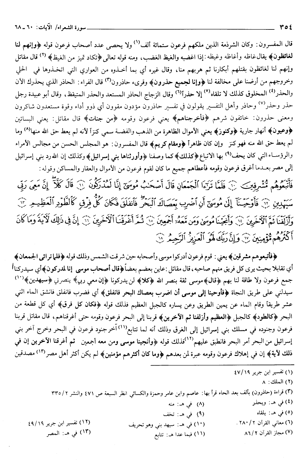 وقوله: {فَأَتْبَعُوهُمْ مُشْرِقِينَ {60} فَلَمَّا تَرَاءَى الْجَمْعَانِ قَالَ أَصْحَابُ مُوسَى إِنَّا لَمُدْرَكُونَ {61} قَالَ كَلَّا إِنَّ مَعِيَ رَبِّي سَيَهْدِينِ {62} فَأَوْحَيْنَا إِلَى مُوسَى أَنِ اضْرِبْ بِعَصَاكَ الْبَحْرَ فَانْفَلَقَ فَكَانَ كُلُّ فِرْقٍ كَالطَّوْدِ الْعَظِيمِ {63} وَأَزْلَفْنَا ثَمَّ الآخَرِينَ {64} وَأَنْجَيْنَا مُوسَى وَمَنْ مَعَهُ أَجْمَعِينَ {65} ثُمَّ أَغْرَقْنَا الآخَرِينَ {66} إِنَّ فِي ذَلِكَ لآيَةً وَمَا كَانَ أَكْثَرُهُمْ مُؤْمِنِينَ {67} وَإِنَّ رَبَّكَ لَهُوَ الْعَزِيزُ الرَّحِيمُ {68} } [الشعراء: 60-68] {فَأَتْبَعُوهُمْ مُشْرِقِينَ} [الشعراء: 60] يعني: قوم فرعون أدركوا موسى وأصحابه حين شرقت الشمس.